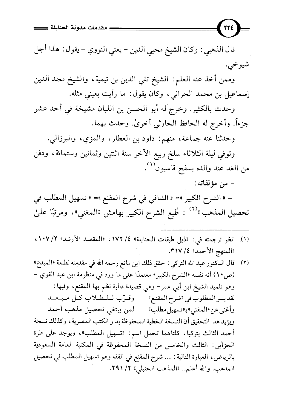 - " الشرح الكبير" = "الشافي في شرح المقنع" = "تسهيل المطلب في تحصيل المذهب" (¬2): طُبع الشرح الكبير بهامش "المغني"، ومرتبًا على