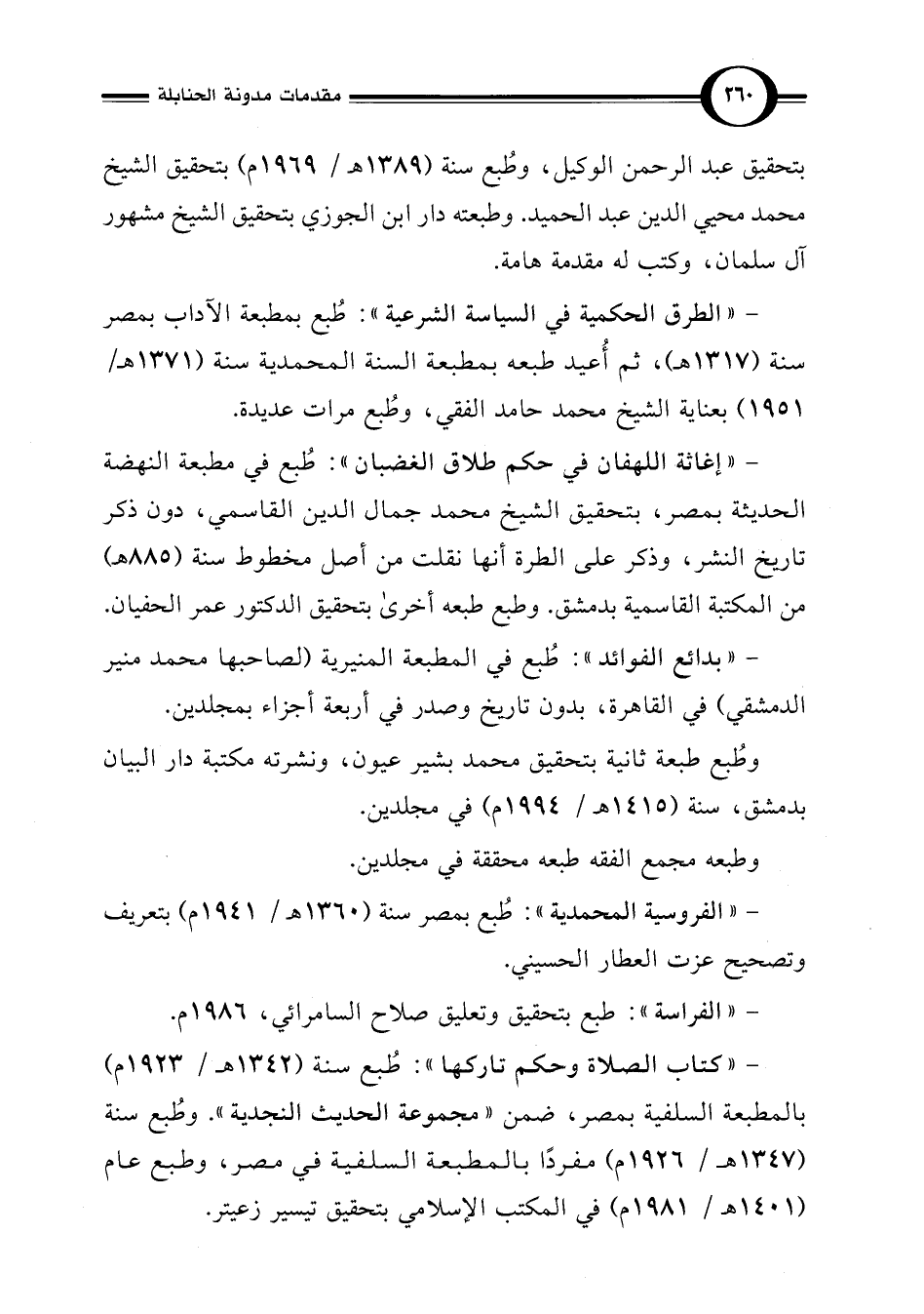 - "كتاب الصلاة وحكم تاركها": طُبع سنة (1342 هـ/ 1923 م) بالمطبعة السلفية بمصر، ضمن "مجموعة الحديث النجدية". وطُبع سنة (1347 هـ/ 1926 م) مفردًا بالمطبعة السلفية في مصر، وطبع عام (1401 هـ/ 1981 م) في المكتب الإسلامي بتحقيق تيسير زعيتر.