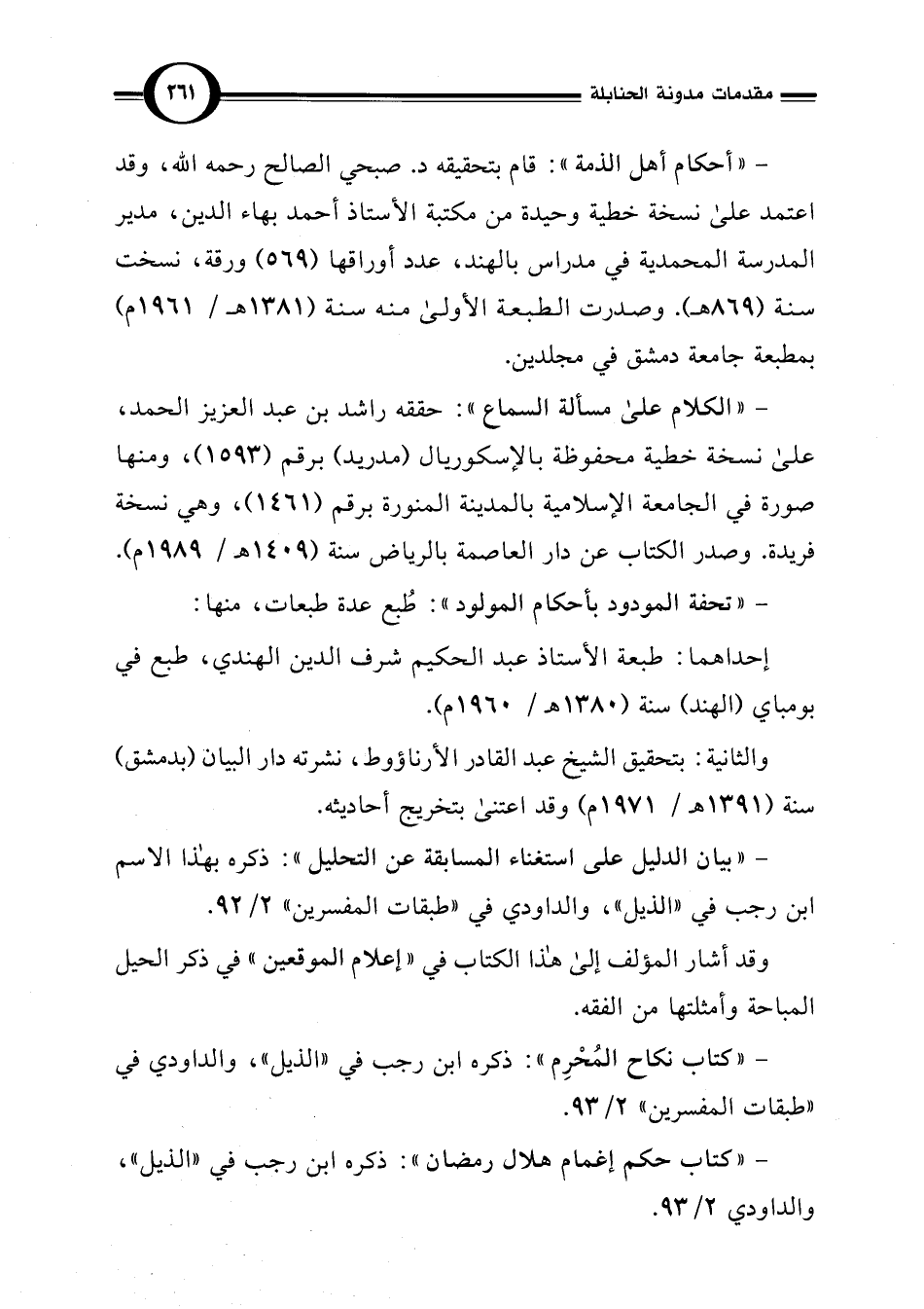 - "أحكام أهل الذمة": قام بتحقيقه د. صبحي الصالح رحمه اللَّه، وقد اعتمد على نسخة خطية وحيدة من مكتبة الأستاذ أحمد بهاء الدين، مدير المدرسة المحمدية في مدراس بالهند، عدد أوراقها (569) ورقة، نسخت سنة (869 هـ). وصدرت الطبعة الأولى منه سنة (1381 هـ/ 1961 م) بمطبعة جامعة دمشق في مجلدين.