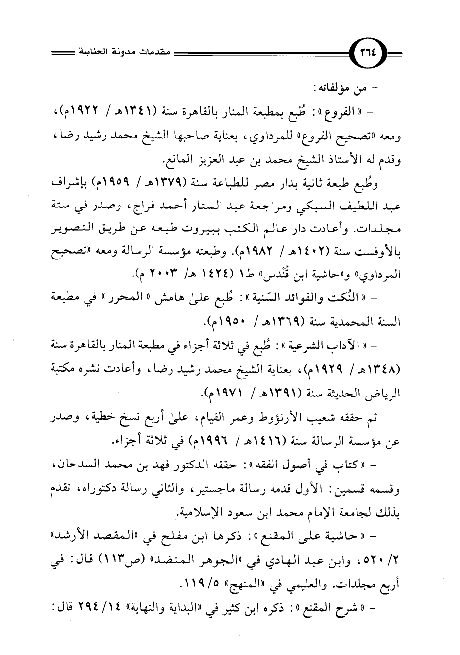 - " الفروع": طُبع بمطبعة المنار بالقاهرة سنة (1341 هـ/ 1922 م)، ومعه "تصحيح الفروع" للمرداوي، بعناية صاحبها الشيخ محمد رشيد رضا، وقدم له الأستاذ الشيخ محمد بن عبد العزيز المانع.
