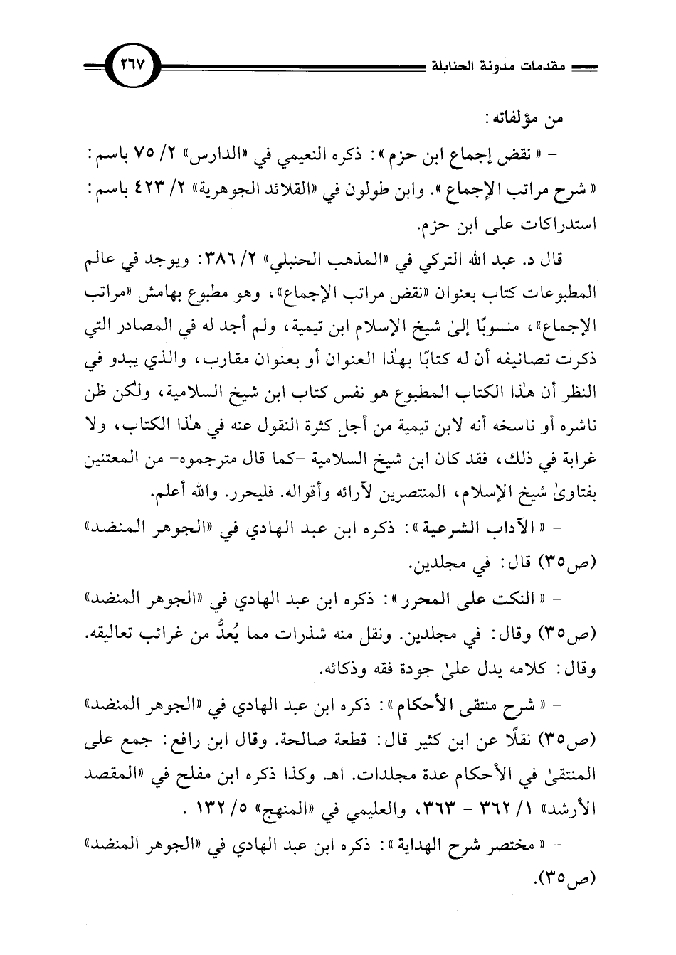 - "شرح منتقى الأحكام": ذكره ابن عبد الهادي في "الجوهر المنضد" (ص 35) نقلًا عن ابن كثير قال: قطعة صالحة. وقال ابن رافع: جمع على المنتقى في الأحكام عدة مجلدات. اهـ. وكذا ذكره ابن مفلح في "المقصد الأرشد" 1/ 362 - 363، والعليمي في "المنهج" 5/ 132.