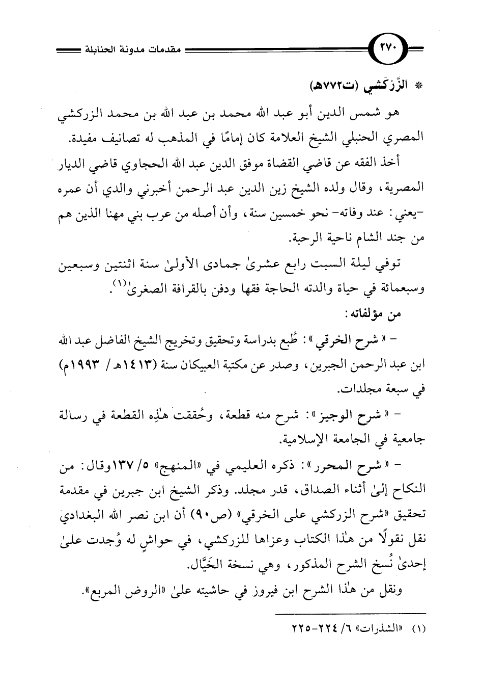 هو شمس الدين أبو عبد اللَّه محمد بن عبد اللَّه بن محمد الزركشي المصري الحنبلي الشيخ العلامة كان إمامًا في المذهب له تصانيف مفيدة.