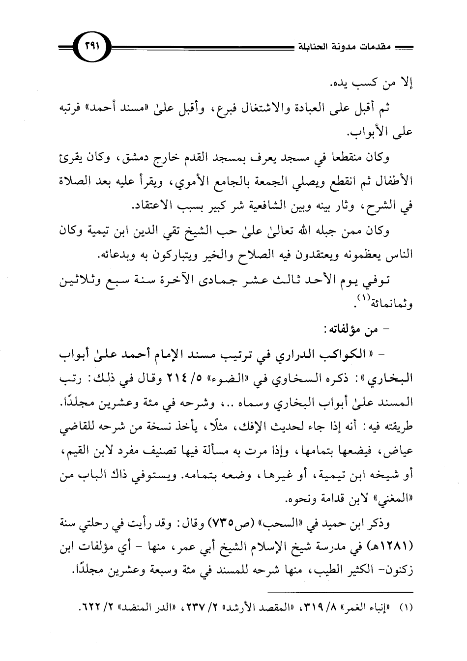 - " الكواكب الدراري في ترتيب مسند الإمام أحمد على أبواب البخاري": ذكره السخاوي في "الضوء" 5/ 214 وقال في ذلك: رتب المسند على أبواب البخاري وسماه. .، وشرحه في مئة وعشرين مجلدًا. طريقته فيه: أنه إذا جاء لحديث الإفك، مثلًا، يأخذ نسخة من شرحه للقاضي عياض، فيضعها بتمامها، وإذا مرت به مسألة فيها تصنيف مفرد لابن القيم، أو شيخه ابن تيمية، أو غيرها، وضعه بتمامه. ويستوفي ذاك الباب من "المغني" لابن قدامة ونحوه.