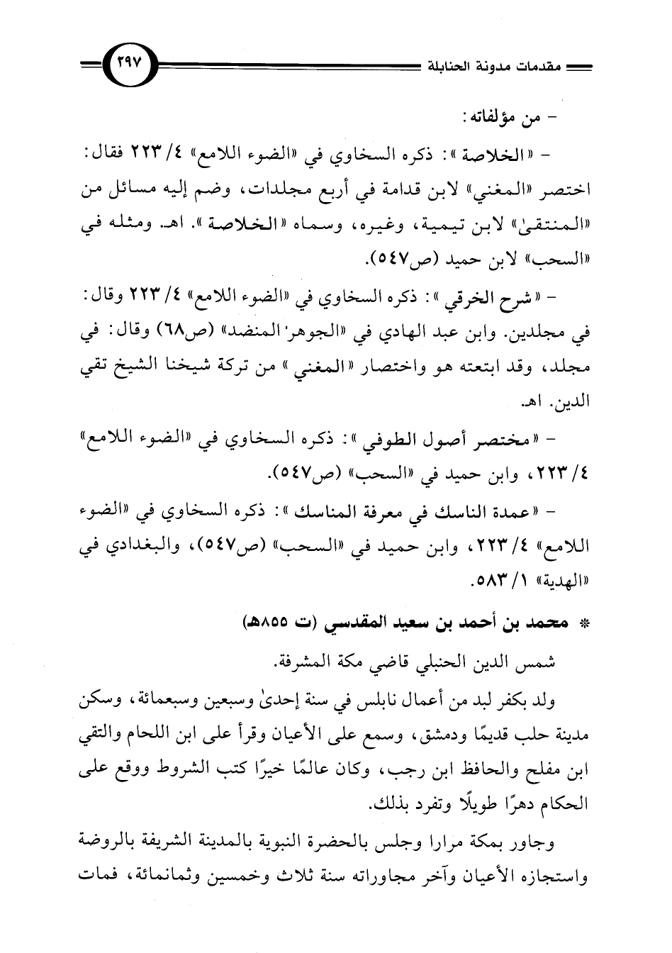 - " الخلاصة": ذكره السخاوي في "الضوء اللامع" 4/ 223 فقال: اختصر "المغني" لابن قدامة في أربع مجلدات، وضم إليه مسائل من "المنتقى" لابن تيمية، وغيره، وسماه "الخلاصة". اهـ. ومثله في "السحب" لابن حميد (ص 547).
