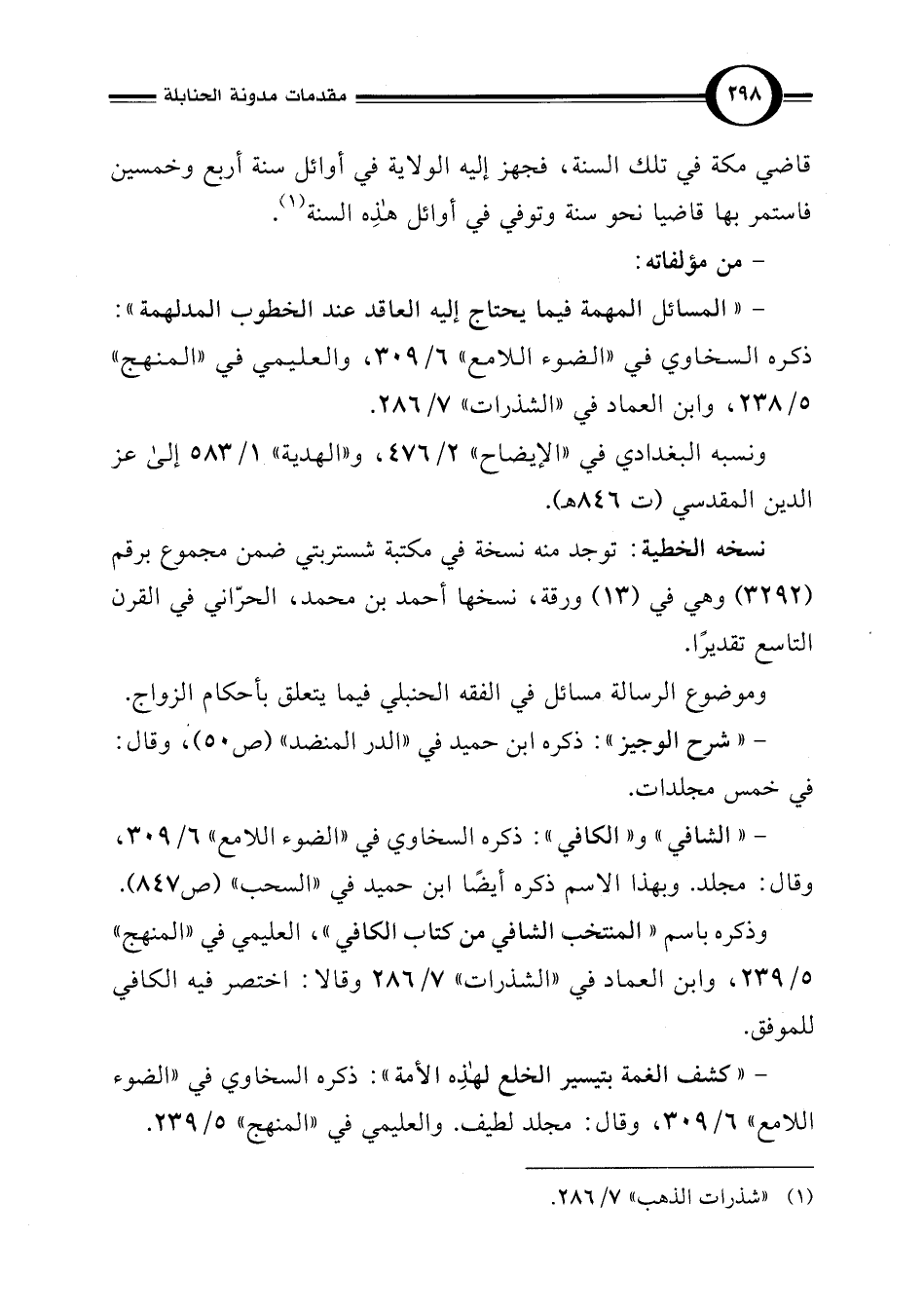 - " المسائل المهمة فيما يحتاج إليه العاقد عند الخطوب المدلهمة": ذكره السخاوي في "الضوء اللامع" 6/ 309، والعليمي في "المنهج" 5/ 238، وابن العماد في "الشذرات" 7/ 286.