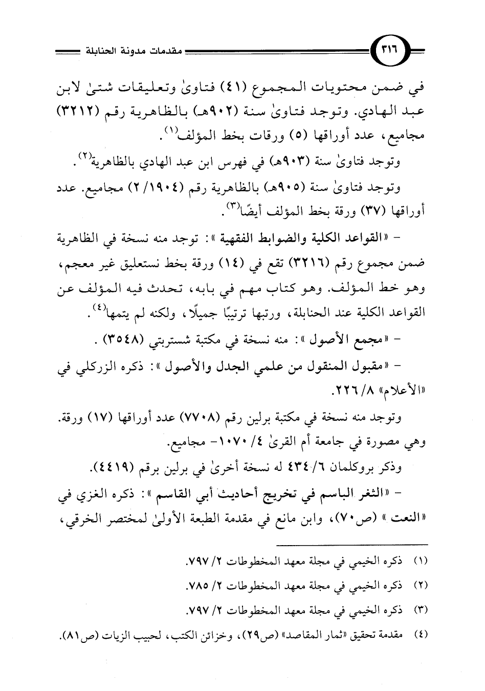 في ضمن محتويات المجموع (41) فتاوى وتعليقات شتى لابن عبد الهادي. وتوجد فتاوى سنة (902 هـ) بالظاهرية رقم (3212) مجاميع، عدد أوراقها (5) ورقات بخط المؤلف (¬1).