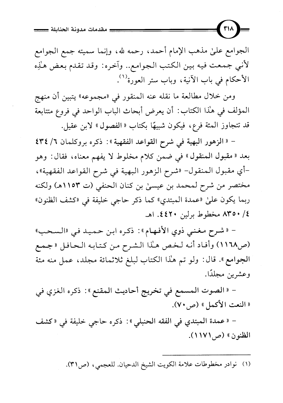 الجوامع على مذهب الإمام أحمد، رحمه للَّه، وإنما سميته جمع الجوامع لأني جمعت فيه بين الكتب الجوامع. . وآخره: وقد تقدم بعض هذِه الأحكام في باب الآنية، وباب ستر العورة (¬1).