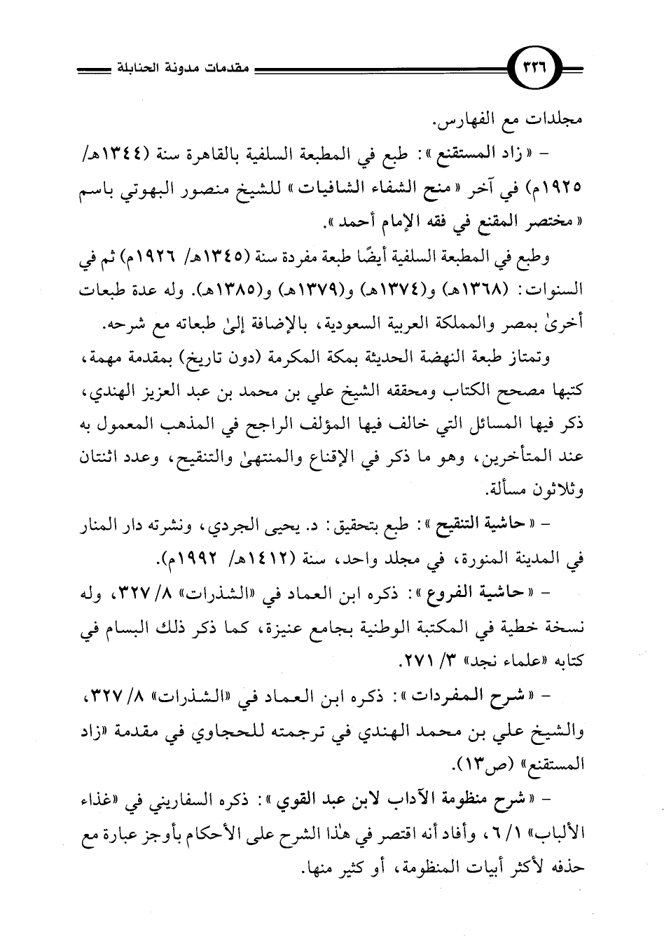 - "زاد المستقنع": طبع في المطبعة السلفية بالقاهرة سنة (1344 هـ/ 1925 م) في آخر "منح الشفاء الشافيات" للشيخ منصور البهوتي باسم "مختصر المقنع في فقه الإمام أحمد".