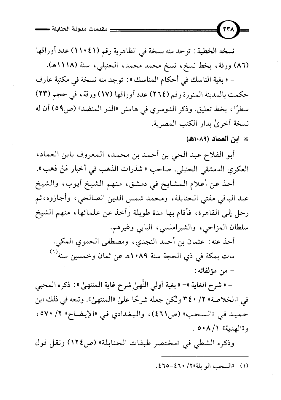 - " شرح الغاية" = "بغية أولي النّهى شرح غاية المنتهى": ذكره المحبي في "الخلاصة" 2/ 340 ولكن جعله شرحًا على "المنتهى". وتبعه في ذلك ابن حميد في "السحب" (ص 461)، والبغدادي في "الإيضاح" 2/ 570، و"الهدية" 1/ 508.