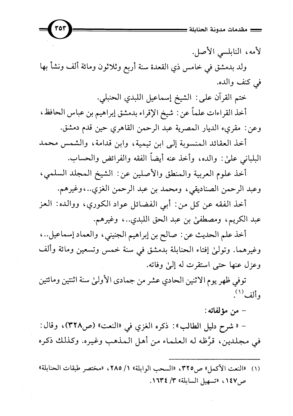 (¬1) "النعت الأكمل" ص 325، "السحب الوابلة" 1/ 285، "مختصر طبقات الحنابلة" ص 147، "تسهيل السابلة" 3/ 1634.