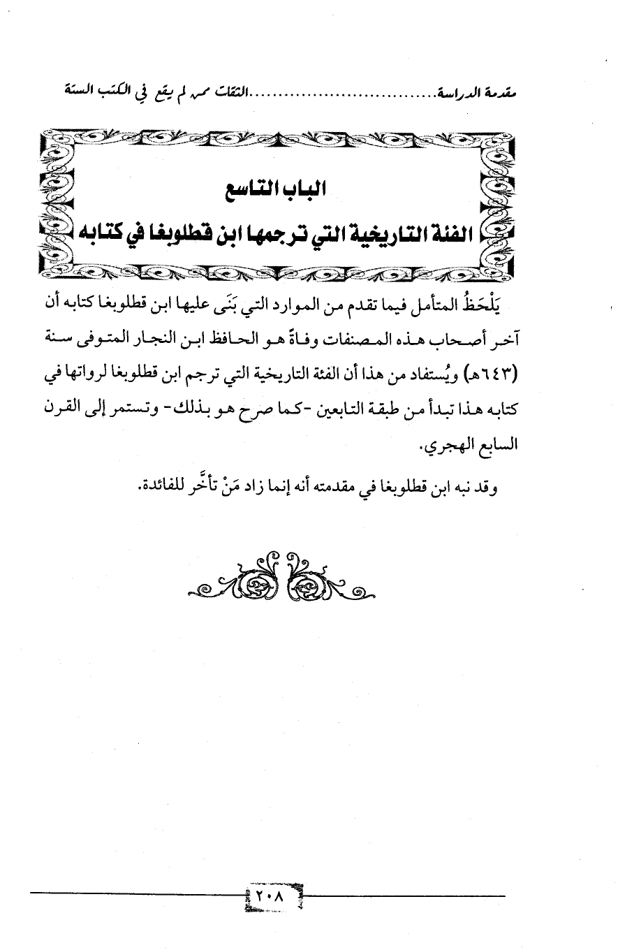 يَلْحَظُ المتأمل فيما تقدم من الموارد التي بَنَى عليها ابن قطلوبغا كتابه أن آخر أصحاب هذه المصنفات وفاةً هو الحافظ ابن النجار المتوفى سنة (643هـ) ويُستفاد من هذا أن الفئة التاريخية التي ترجم ابن قطلوبغا لرواتها في كتابه هذا تبدأ من طبقة التابعين -كما صرح هو بذلك- وتستمر إلى القرن السابع الهجري.