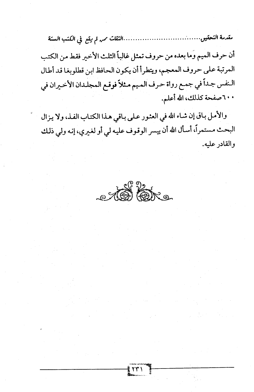 أن حرف الميم وما بعده من حروف تمثل غالباً الثلث الأخير فقط من الكتب المرتبة على حروف المعجم، ويتطرأ أن يكون الحافظ ابن قطلوبغا قد أطال النفس جداً في جمع رواة حرف الميم مثلاً فوقع المجلدان الأخيران في 600صفحة كذلك، الله أعلم.