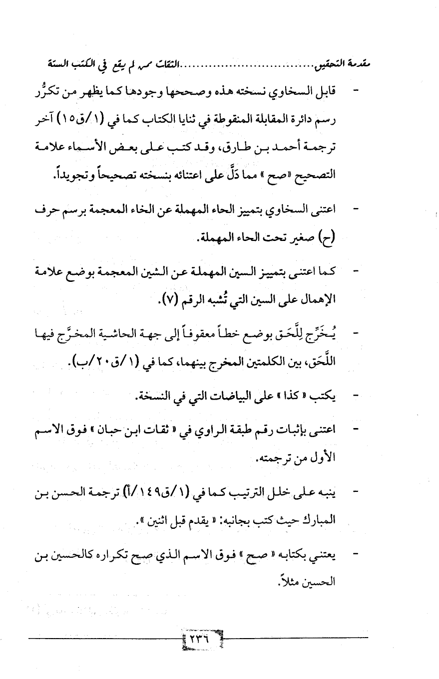 - ينبه على خلل الترتيب كما في (1/ق149/أ) ترجمة الحسن بن المبارك حيث كتب بجانبه: «يقدم قبل اثنين».