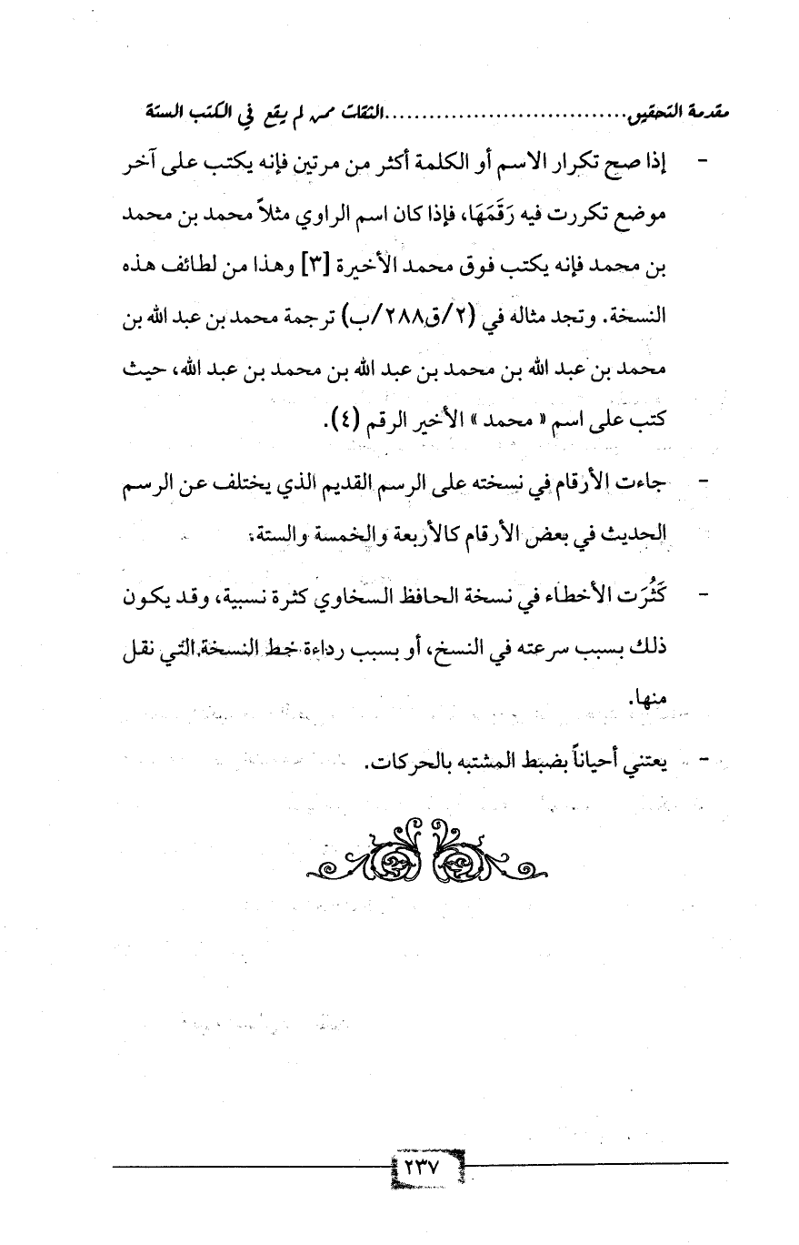 - إذا صح تكرار الاسم أو الكلمة أكثر من مرتين فإنه يكتب على آخر موضع تكررت فيه رَقَمَهَا، فإذا كان اسم الراوي مثلاً محمد بن محمد بن محمد فإنه يكتب فوق محمد الأخيرة [3] وهذا من لطائف هذه النسخة. وتجد مثاله في (2/ق288/ب) ترجمة محمد بن عبد الله بن محمد بن عبد الله بن محمد بن عبد الله بن محمد بن عبد الله، حيث كتب على اسم «محمد» الأخير الرقم (4).