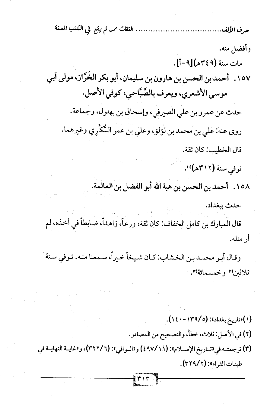 157 - أحمد بن الحسن بن هارون بن سليمان، أبو بكر الخَرَّاز، مولى أبي موسى الأشعري، ويعرف بالصَّبَّاحي، كوفي الأصل.