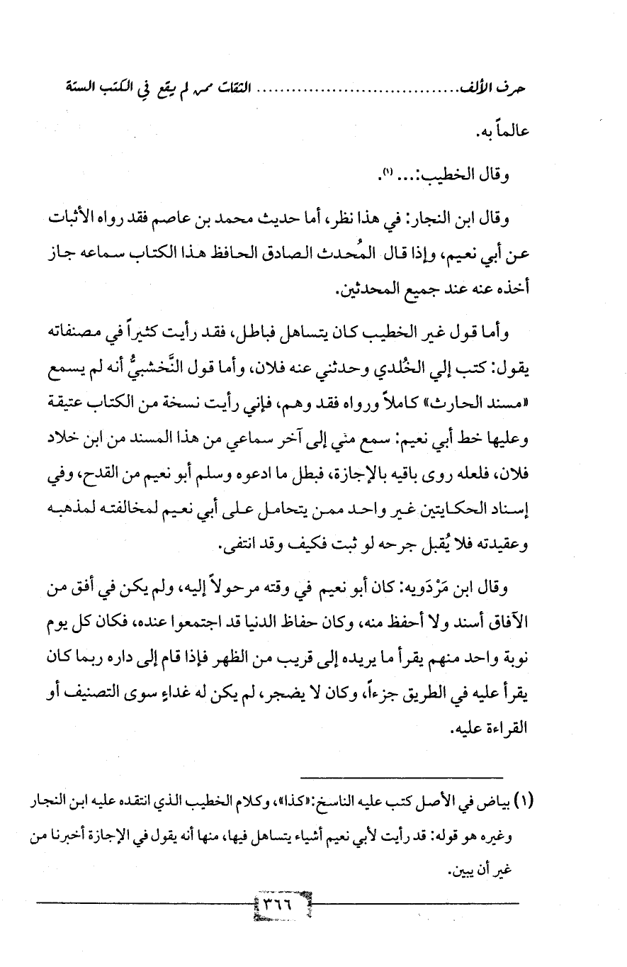 وأما قول غير الخطيب كان يتساهل فباطل، فقد رأيت كثيراً في مصنفاته يقول: كتب إلي الخُلدي وحدثني عنه فلان، وأما قول النَّخشبيُّ أنه لم يسمع «مسند الحارث» كاملاً ورواه فقد وهم، فإني رأيت نسخة من الكتاب عتيقة وعليها خط أبي نعيم: سمع مني إلى آخر سماعي من هذا المسند من ابن خلاد فلان، فلعله روى باقيه بالإجازة، فبطل ما ادعوه وسلم أبو نعيم من القدح، وفي إسناد الحكايتين غير واحد ممن يتحامل على أبي نعيم لمخالفته لمذهبه وعقيدته فلا يُقبل جرحه لو ثبت فكيف وقد انتفى.