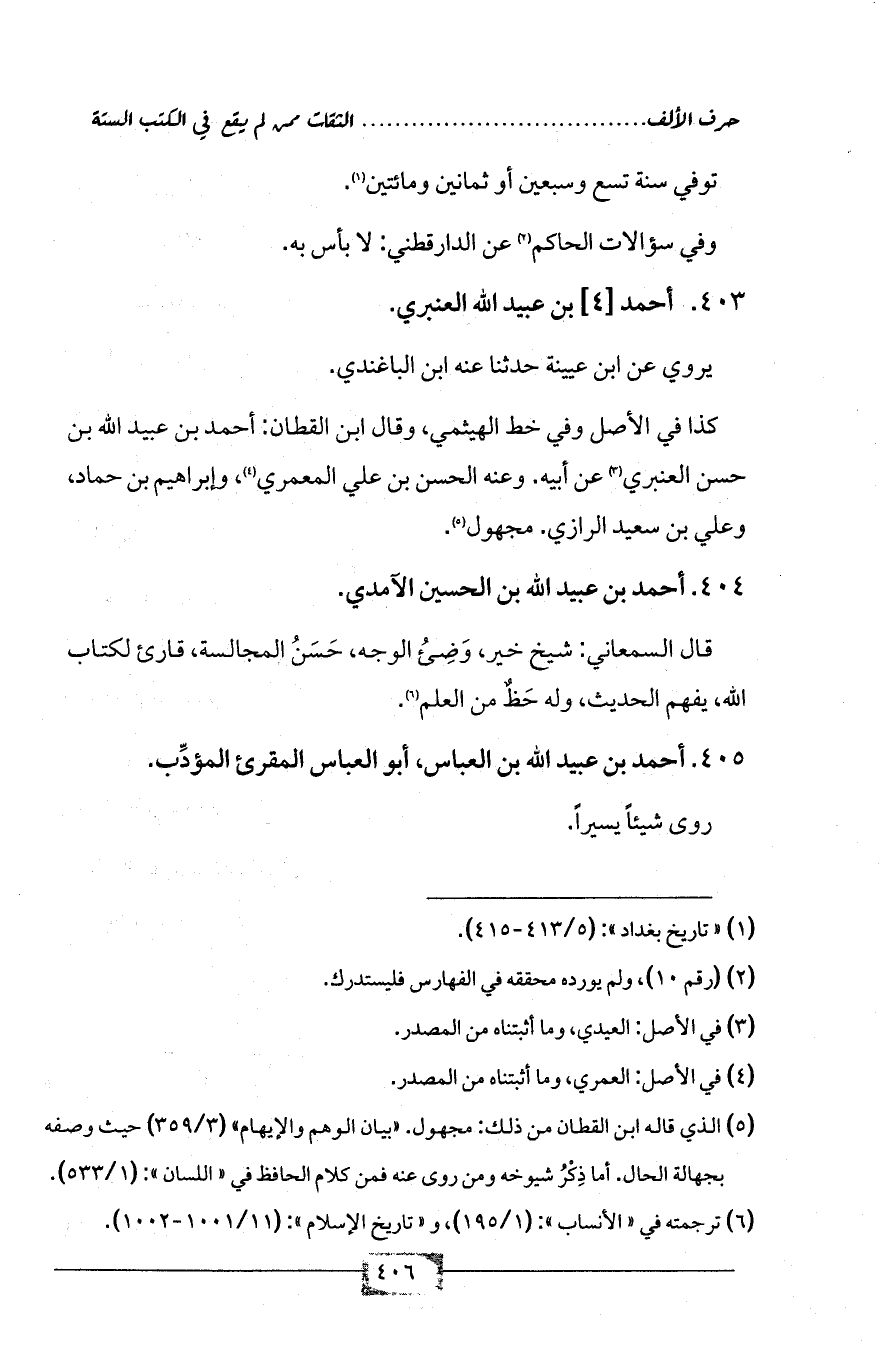 (¬5) الذي قاله ابن القطان من ذلك: مجهول. «بيان الوهم والإيهام» (3/ 359) حيث وصفه بجهالة الحال. أما ذِكْرُ شيوخه ومن روى عنه فمن كلام الحافظ في «اللسان»: (1/ 533).