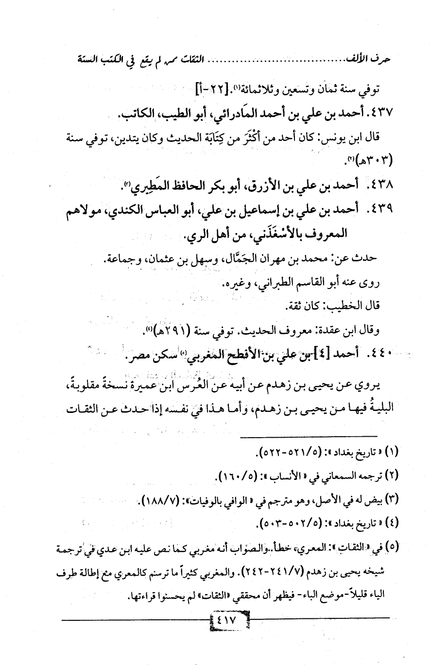 (¬5) في «الثقات»: المعري، خطأ. والصواب أنه مغربي كما نص عليه ابن عدي في ترجمة شيخه يحيى بن زهدم (7/ 241 - 242). والمغربي كثيراً ما ترسم كالمعري مع إطالة طرف الياء قليلاً-موضع الباء- فيظهر أن محققي «الثقات» لم يحسنوا قراءتها.