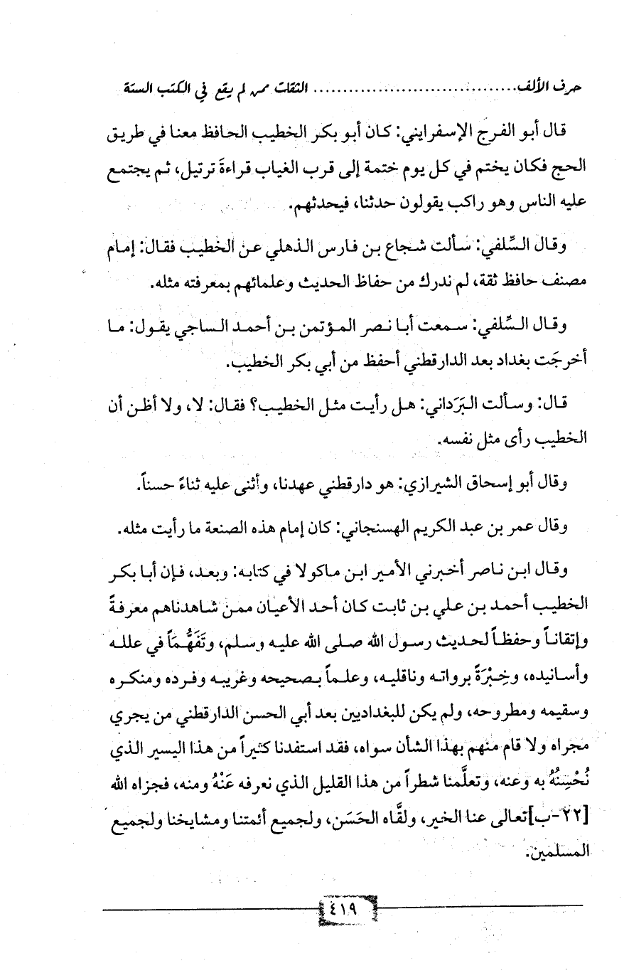 وقال ابن ناصر أخبرني الأمير ابن ماكولا في كتابه: وبعد، فإن أبا بكر الخطيب أحمد بن علي بن ثابت كان أحد الأعيان ممن شاهدناهم معرفةً وإتقاناً وحفظاً لحديث رسول الله صلى الله عليه وسلم، وتَفَهُّمَاً في علله وأسانيده، وخِبْرَةً برواته وناقليه، وعلماً بصحيحه وغريبه وفرده ومنكره وسقيمه ومطروحه، ولم يكن للبغداديين بعد أبي الحسن الدارقطني من يجري مجراه ولا قام منهم بهذا الشأن سواه، فقد استفدنا كثيراً من هذا اليسير الذي نُحْسِنُهُ به وعنه، وتعلَّمنا شطراً من هذا القليل الذي نعرفه عَنْهُ ومنه، فجزاه الله [22 - ب] تعالى عنا الخير، ولقَّاه الحَسَن، ولجميع أئمتنا ومشايخنا ولجميع المسلمين.