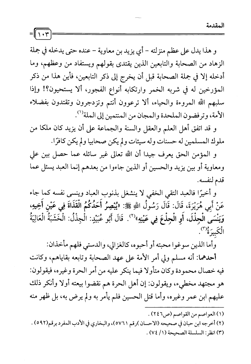 وهذا يدل على عظم منزلته -أي يزيد بن معاوية- عنده حتى يدخله في جملة الزهاد من الصحابة والتابعين الذين يقتدى بقولهم ويستفاد من وعظهم، وما أدخله إلا في جملة الصحابة قبل أن يخرج إلى ذكر التابعين، فأين هذا من ذكر المؤرخين له في شربه الخمر وارتكابه أنواع الفجور، ألا يستحيون؟! وإذا سلبهم الله المروءة والحياء، ألا ترعوون أنتم وتزدجرون وتقتدون بفضلاء الأمة، وترفضون الملحدة والمجان من المنتمين إلى الملة (¬1).