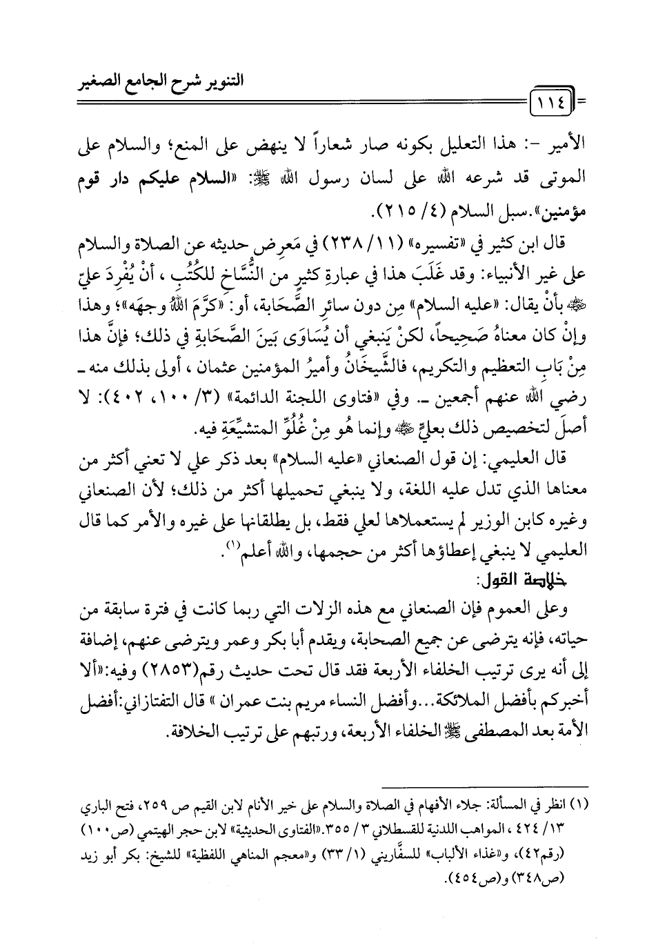 قال العليمي: إن قول الصنعاني "عليه السلام" بعد ذكر علي لا تعني أكثر من معناها الذي تدل عليه اللغة، ولا ينبغي تحميلها أكثر من ذلك؛ لأن الصنعاني وغيره كابن الوزير لم يستعملاها لعلي فقط، بل يطلقانها على غيره والأمر كما قال العليمي لا ينبغي إعطاؤها أكثر من حجمها، والله أعلم (¬1).