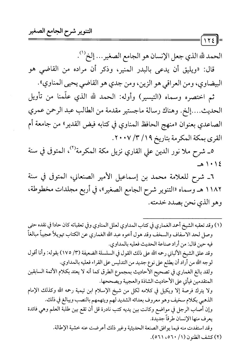 6 - شرح للعلامة محمَّد بن إسماعيل الأمير الصنعاني، المتوفى في سنة 1182 هـ وسماه "التنوير شرح الجامع الصغير"، في أربع مجلدات مخطوطة، وهو الذي نحن بصدد خدمته.