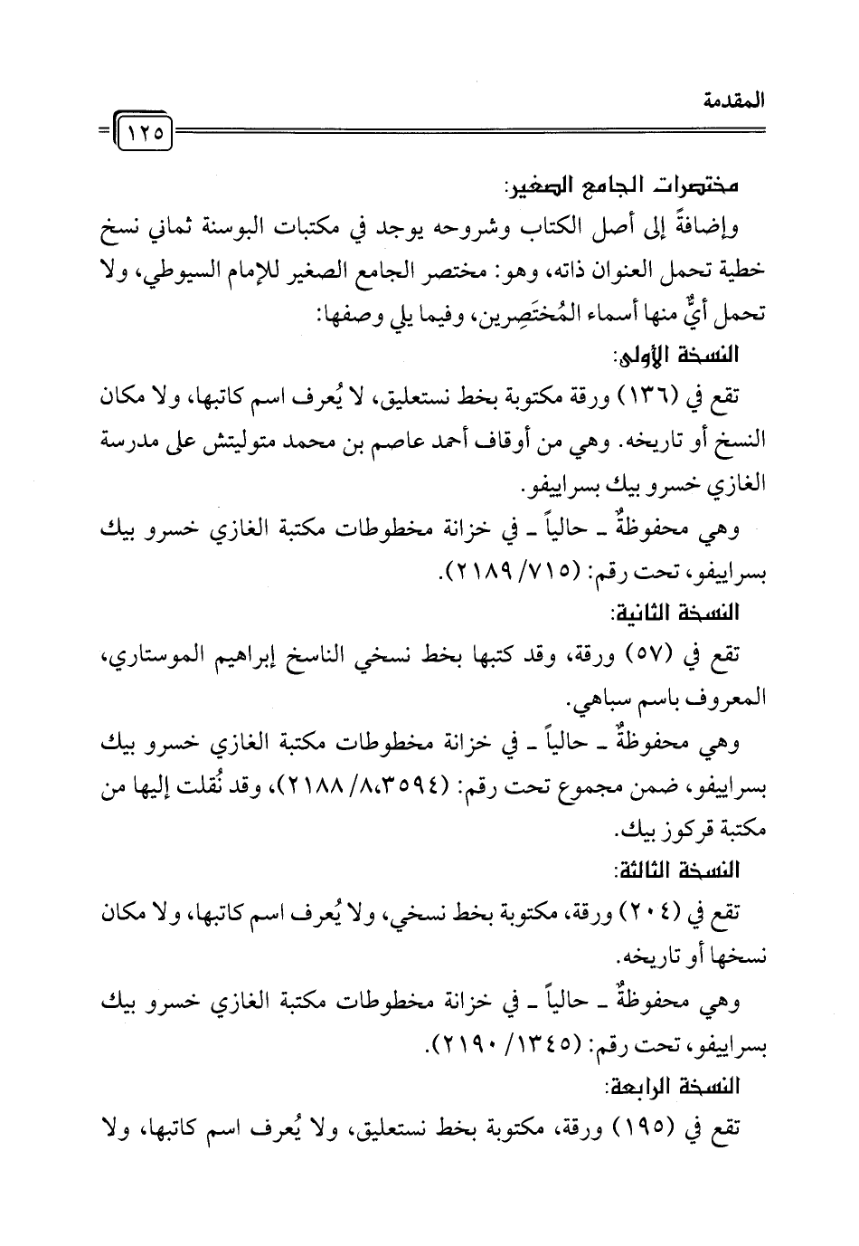 وإضافةً إلى أصل الكتاب وشروحه يوجد في مكتبات البوسنة ثماني نسخ خطية تحمل العنوان ذاته، وهو: مختصر الجامع الصغير للإمام السيوطي، ولا تحمل أيٌّ منها أسماء المُختَصِرين، وفيما يلي وصفها: