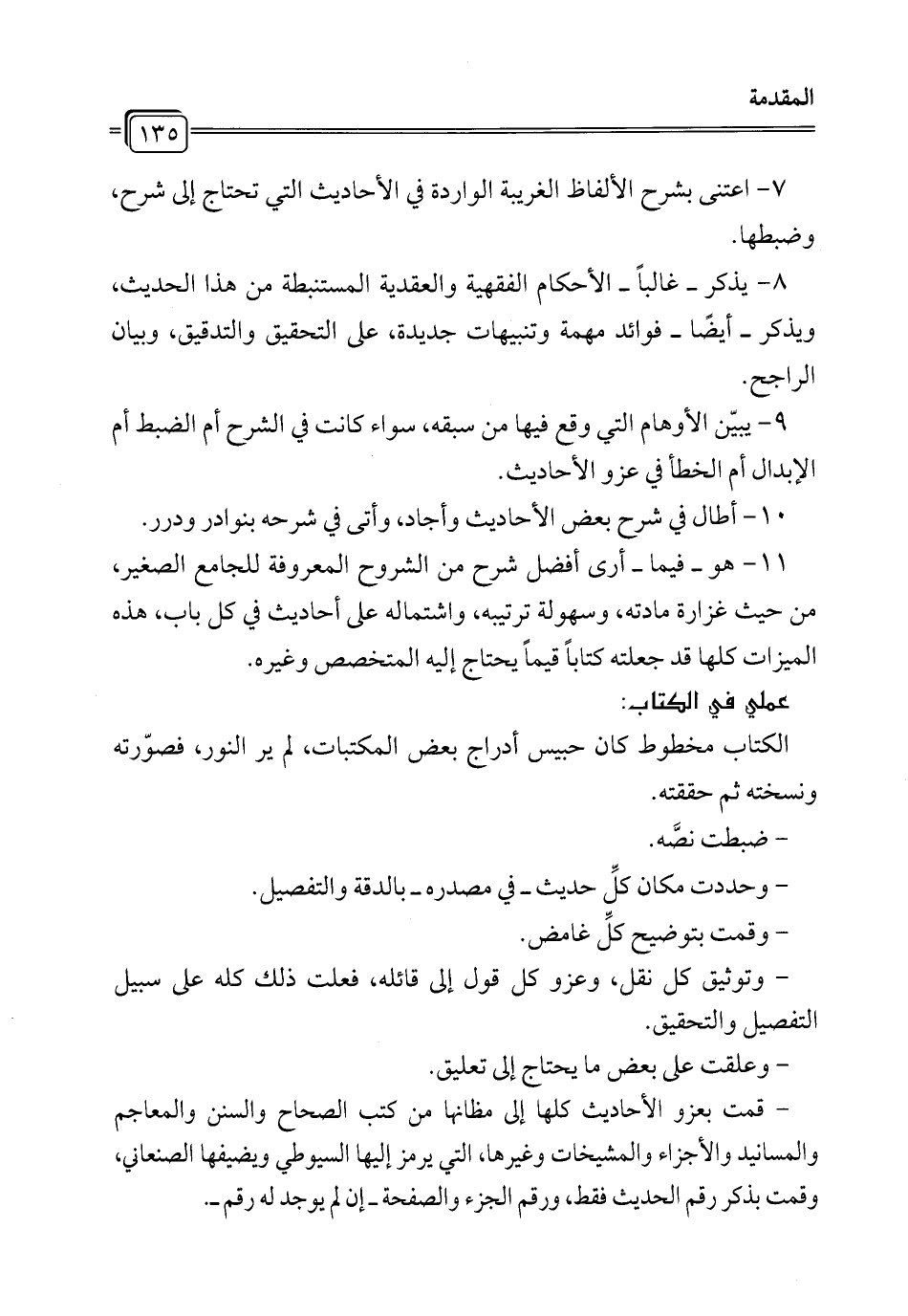 11 - هو -فيما- أرى أفضل شرح من الشروح المعروفة للجامع الصغير، من حيث غزارة مادته، وسهولة ترتيبه، واشتماله على أحاديث في كل باب، هذه الميزات كلها قد جعلته كتاباً قيماً يحتاج إليه المتخصص وغيره.