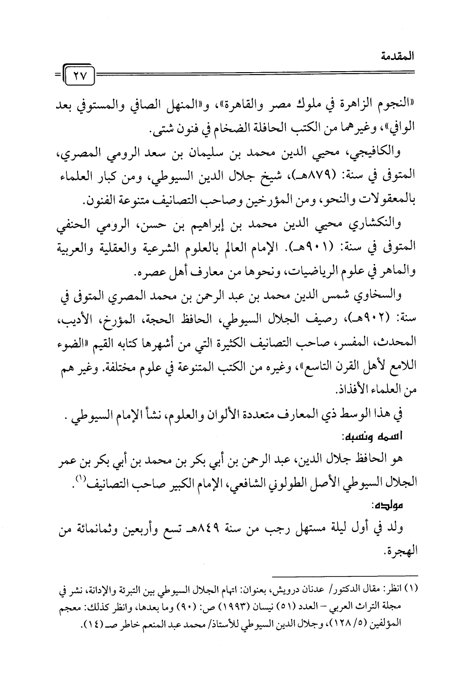 (¬1) انظر: مقال الدكتور/ عدنان درويش، بعنوان: اتهام الجلال السيوطي بين التبرئة والإدانة، نشر في مجلة التراث العربي - العدد (51) نيسان (1993) ص: (90) وما بعدها، وانظر كذلك: معجم المؤلفين (5/ 128)، وجلال الدين السيوطي للأستاذ/ محمَّد عبد المنعم خاطر صـ (14).