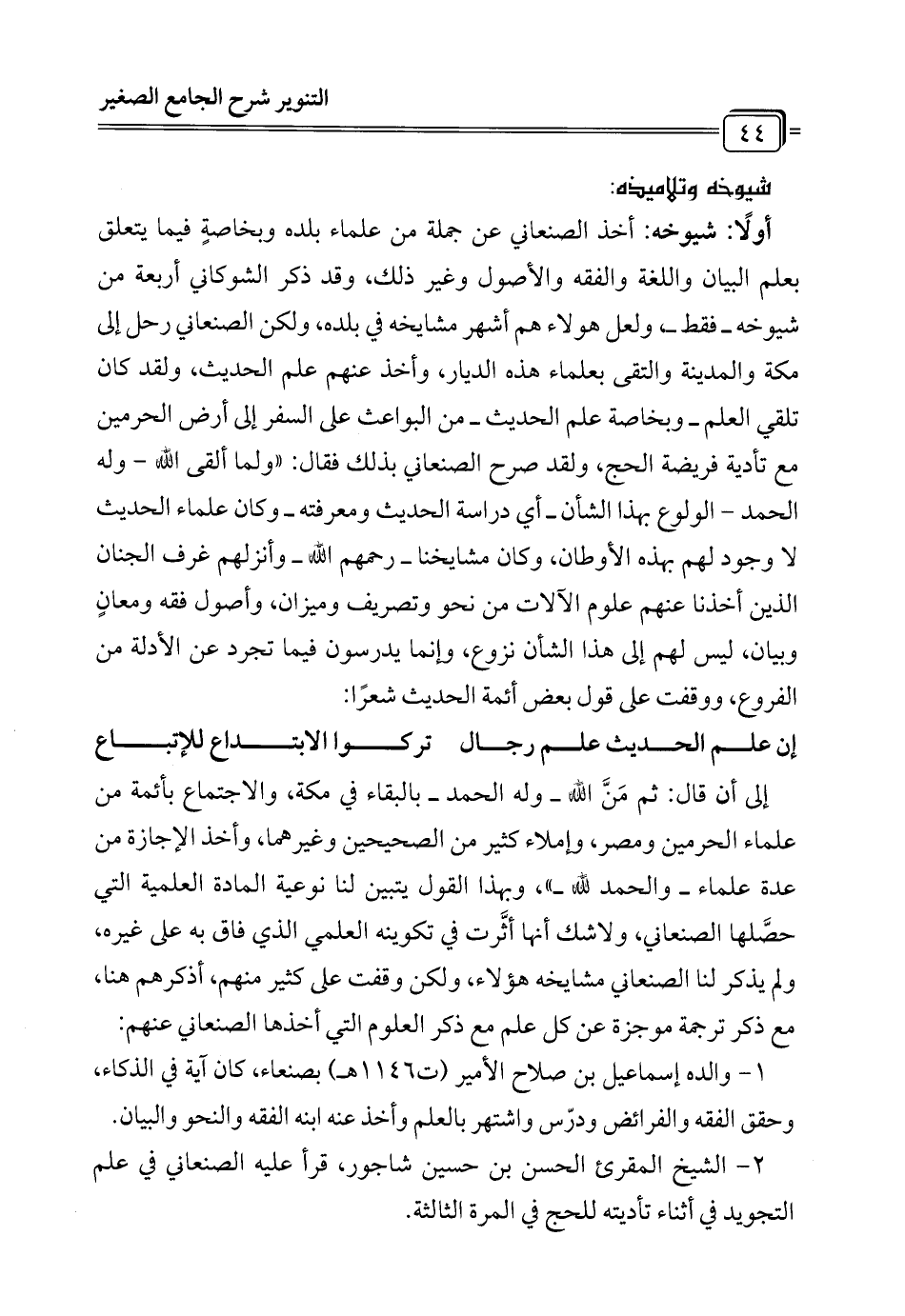 إلى أن قال: ثم مَنَّ الله -وله الحمد- بالبقاء في مكة، والاجتماع بأئمة من علماء الحرمين ومصر، وإملاء كثير من الصحيحين وغيرهما، وأخذ الإجازة من عدة علماء -والحمد لله-"، وبهذا القول يتبين لنا نوعية المادة العلمية التي حصَّلها الصنعاني، ولاشك أنها أثَّرت في تكوينه العلمي الذي فاق به على غيره، ولم يذكر لنا الصنعاني مشايخه هؤلاء، ولكن وقفت على كثير منهم، أذكرهم هنا، مع ذكر ترجمة موجزة عن كل علم مع ذكر العلوم التي أخذها الصنعاني عنهم: