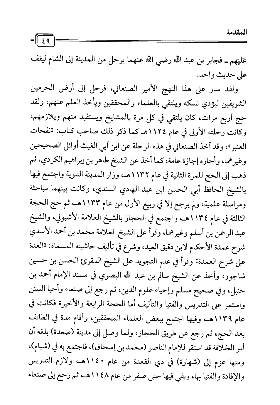 ولقد سار على هذا النهج الأمير الصنعاني، فرحل إلى أرض الحرمين الشريفين ليؤدي نسكه ويلتقي بالعلماء والمحققين ويأخذ العلم عنهم، ولقد حج أربع مرات، كان يلتقي في كل مرة بالمشايخ ويستفيد منهم ويلازمهم، وكانت رحلته الأولى في عام 1124 هـ كما ذكر ذلك صاحب كتاب: "نفحات العنبر"، وقد أخذ الصنعاني في هذه الرحلة عن ابن أبي الغيث أوائل الصحيحين وغيرهما، وأجازه إجازة عامة، كما أخذ عن الشيخ طاهر بن إبراهيم الكردي، ثم ذهب إلى الحج للمرة الثانية في عام 1132هـ، وزار المدينة النبوية واجتمع فيها بالشيخ الحافظ أبي الحسن ابن عبد الهادي السندي، وكانت بينهما مباحثة ومراسلة علمية، ولم يرجع إلا في ربيع الأول من عام 1133هـ، ثم حج الحجة الثالثة في عام 1134هـ، واجتمع في الحجاز بالشيخ العلامة الأشبولي، والشيخ عبد الرحمن بن أسلم وغيرهما، وقرأ على الشيخ العلامة محمَّد بن أحمد الأسدي شرح عمدة الأحكام لابن دقيق العيد، وشرع في تأليف حاشيته المسماة: "العدة على شرح العمدة" وقرأ في علم التجويد على الشيخ المقرئ الحسن بن حسين شاجور، وأخذ عن الشيخ سالم بن عبد الله البصري في مسند الإِمام أحمد بن حنبل، وفي صحيح مسلم وإحياء علوم الدين، ثم رجع إلى صنعاء وأحيا السنن واستمر على التدريس والفتيا والتأليف أما الحجة الرابعة والأخيرة فكانت في عام 1139هـ، وفيها اجتمع ببعض العلماء المحققين، وأقام مدة في الطائف بعد الحج، ثم رجع عن طريق الحجاز، ولما وصل إلى مدينة (صعدة) بلغه أن أمر الخلافة قد استقر للإمام الناصر (محمَّد بن إسحاق)، فاجتمع به في (شبام)، ومنها عزم إلى (شهارة) في ذي القعدة من عام 1140هـ، ولازم التدريس والإفادة والفتيا بها، وبقي فيها حتى صفر من عام 1148هـ، ثم رجع إلى صنعاء