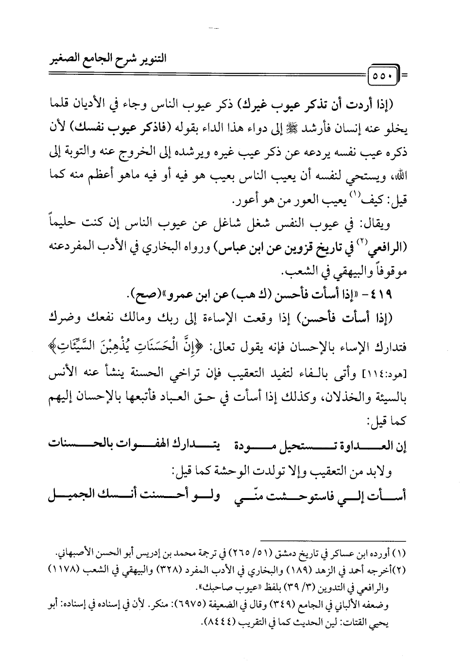 (¬2) أخرجه أحمد في الزهد (189) والبخاري في الأدب المفرد (328) والبيهقي في الشعب (1178) والرافعي في التدوين (3/ 39) بلفظ "عيوب صاحبك".