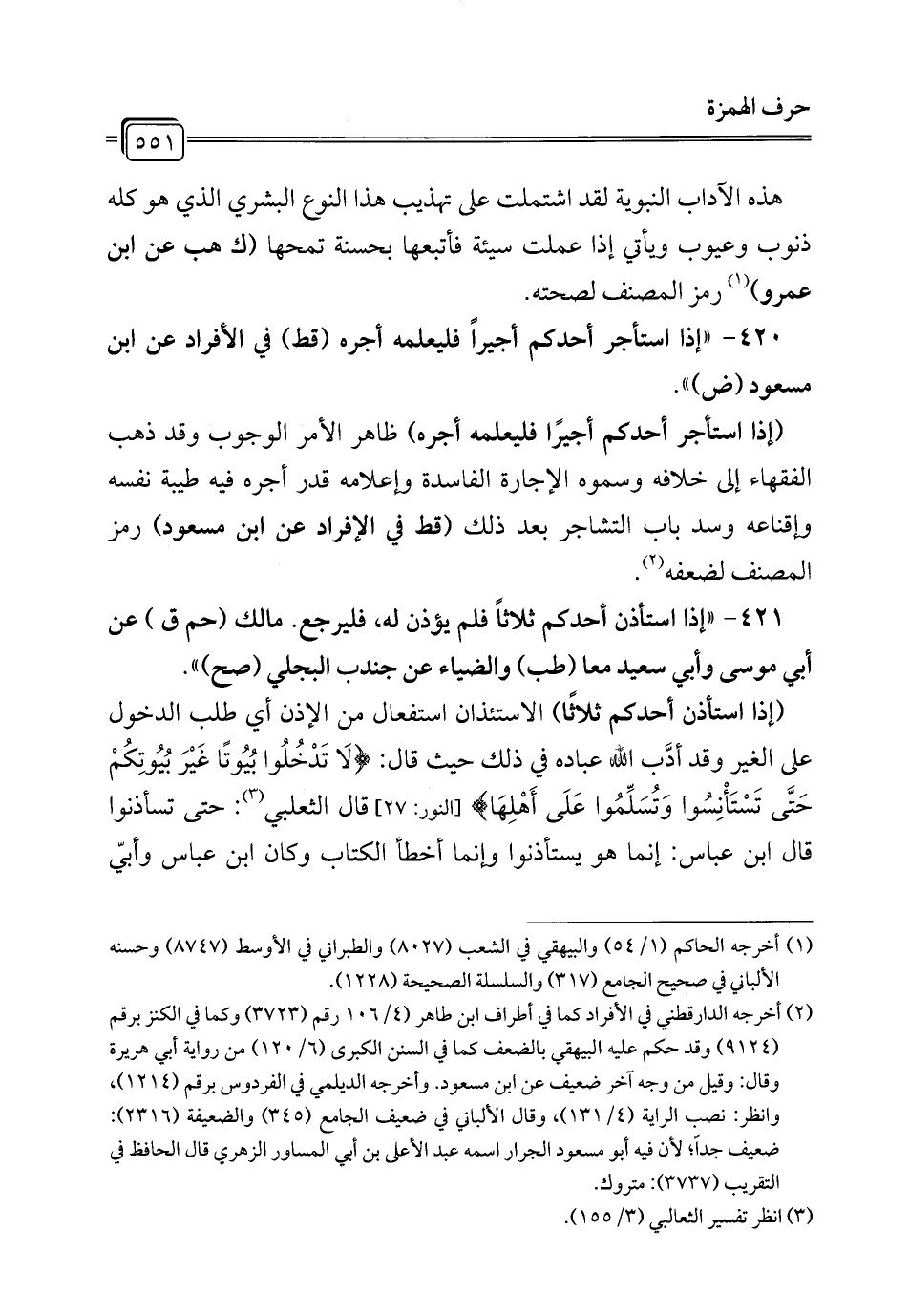 420 - " إذا استأجر أحدكم أجيرًا فليعلمه أجره (قط) في الأفراد عن ابن مسعود (ض) ".