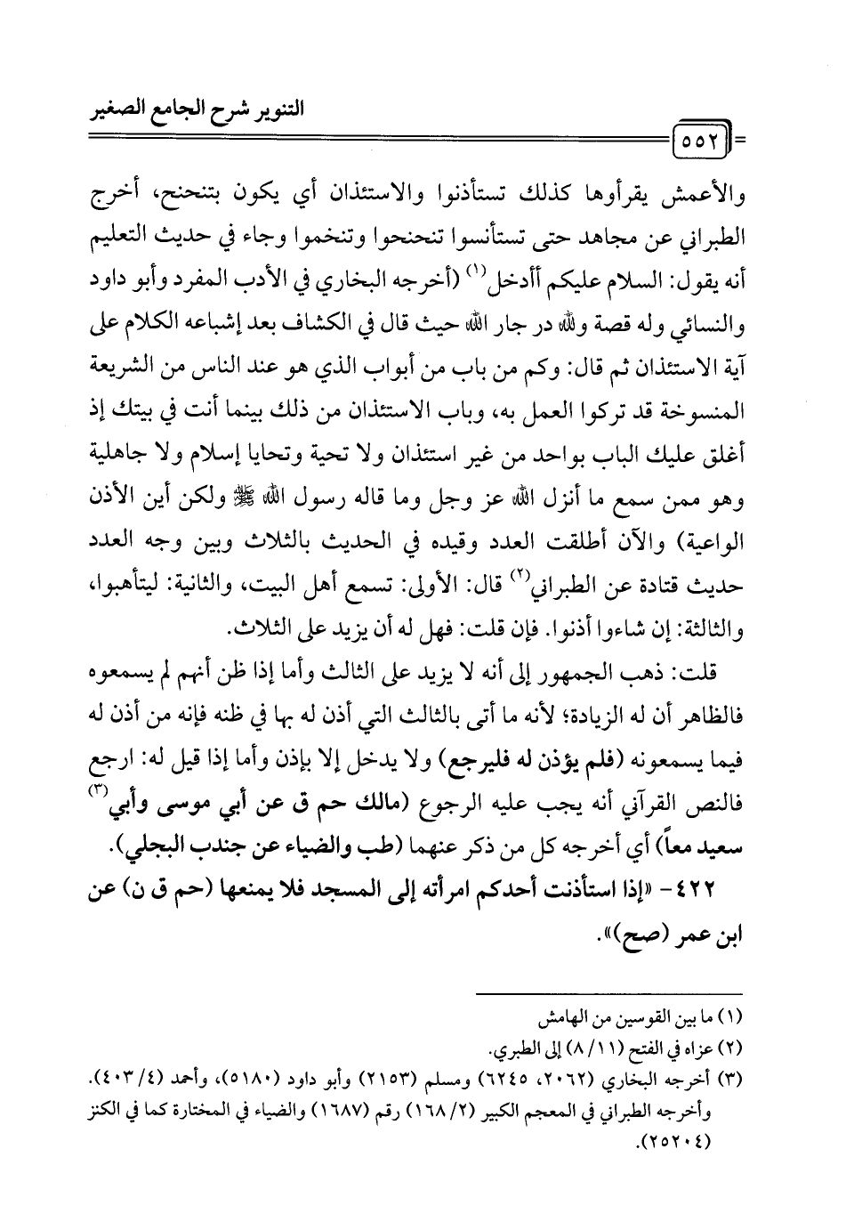 قلت: ذهب الجمهور إلى أنه لا يزيد على الثالث وأما إذا ظن أنهم لم يسمعوه فالظاهر أن له الزيادة؛ لأنه ما أتى بالثالث التي أذن له بها في ظنه فإنه من أذن له فيما يسمعونه (فلم يؤذن له فليرجع) ولا يدخل إلا بإذن وأما إذا قيل له: ارجع فالنص القرآني أنه يجب عليه الرجوع (مالك حم ق عن أبي موسى وأبي (¬3) سعيد معًا) أي أخرجه كل من ذكر عنهما (طب والضياء عن جندب البجلي).