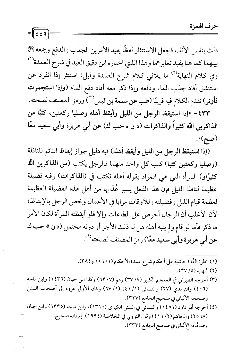 433 - " إذا استيقظ الرجل من الليل وأيقظ أهله وصليا ركعتين، كتبًا من الذاكرين الله كثيرًا والذاكرات (د ن هـ حب ك) عن أبي هريرة وأبي سعيد معًا (صح) ".