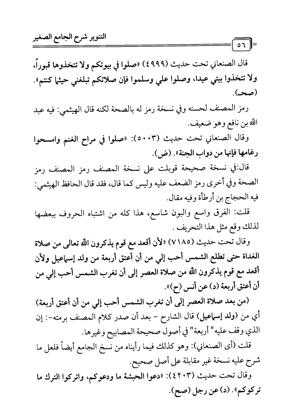 قلت (أي الصنعاني): وهو كذلك فيما رأيناه من نسخ الجامع أيضاً فلعل ما شرح عليه نسخة غير مقابلة على أصل صحيح.