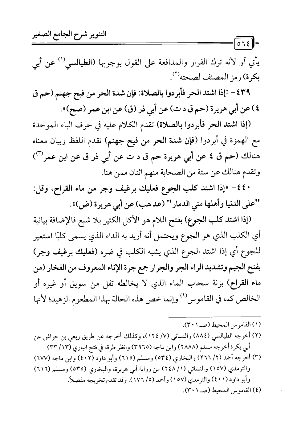 439 - " إذا اشتد الحر فأبردوا بالصلاة: فإن شدة الحر من فيح جهنم (حم ق 4) عن أبي هريرة (حم ق د ت) عن أبي ذر (ق) عن ابن عمر (صح) ".