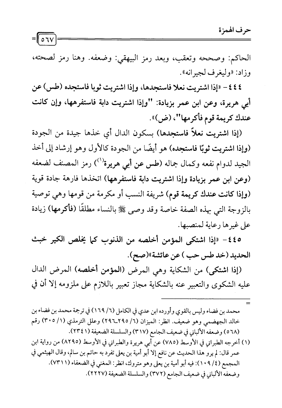 444 - " إذا اشتريت نعلا فاستجدها، وإذا اشتريت ثوبا فاستجده (طس) عن أبي هريرة، وعن ابن عمر بزيادة: "وإذا اشتريت دابة فاستفرهها، وإن كانت عندك كريمة قوم فأكرمها"، (ض) ".
