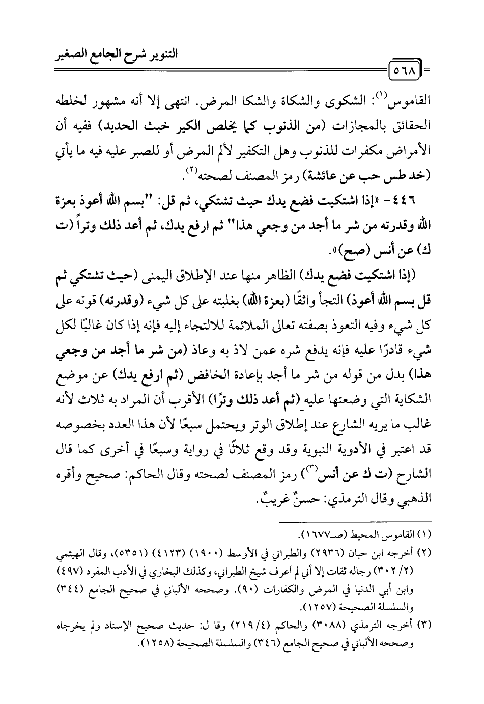 446 - " إذا اشتكيت فضع يدك حيث تشتكي، ثم قل: "بسم الله أعوذ بعزة الله وقدرته من شر ما أجد من وجعي هذا" ثم ارفع يدك، ثم أعد ذلك وترًا (ت ك) عن أنس (صح) ".