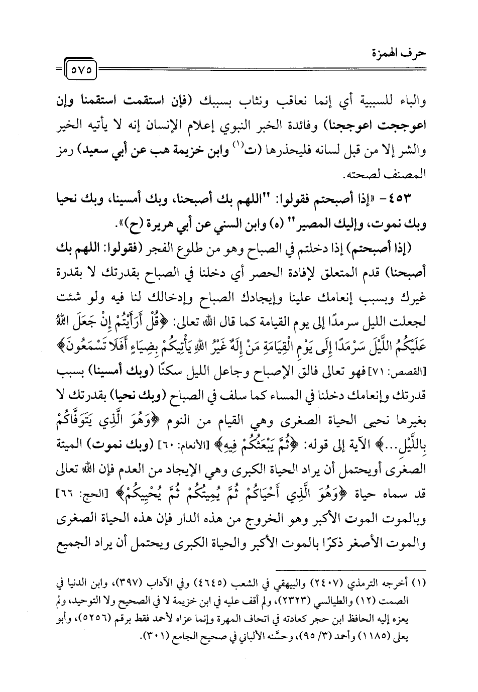 453 - " إذا أصبحتم فقولوا: "اللهم بك أصبحنا، وبك أمسينا، وبك نحيا وبك نموت، وإليك المصير" (هـ) وابن السني عن أبي هريرة (ح) ".