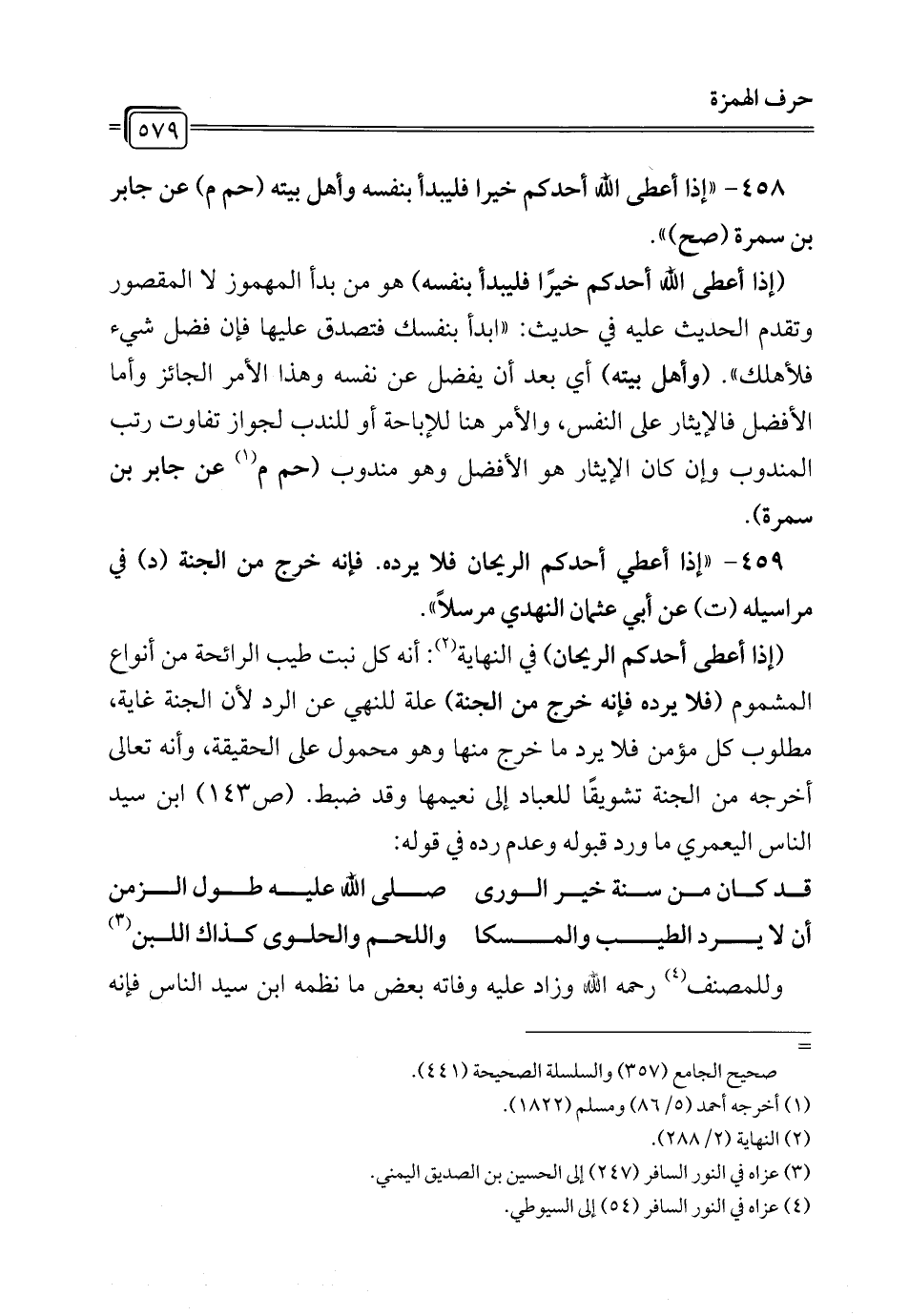 458 - " إذا أعطى الله أحدكم خيرا فليبدأ بنفسه وأهل بيته (حم م) عن جابر بن سمرة (صح) ".