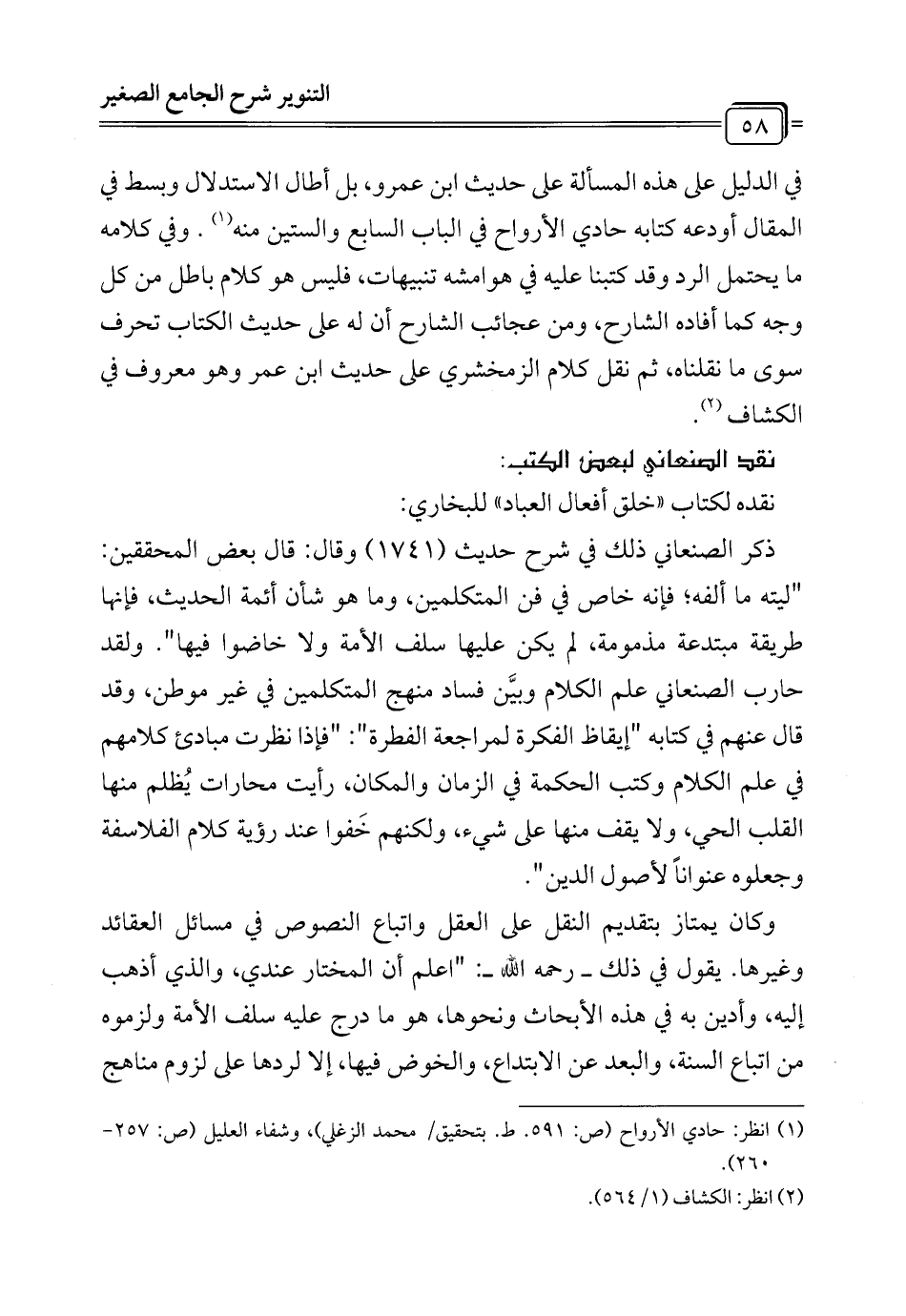 ذكر الصنعاني ذلك في شرح حديث (1741) وقال: قال بعض المحققين: "ليته ما ألفه؛ فإنه خاص في فن المتكلمين، وما هو شأن أئمة الحديث، فإنها طريقة مبتدعة مذمومة، لم يكن عليها سلف الأمة ولا خاضوا فيها". ولقد حارب الصنعاني علم الكلام وبيَّن فساد منهج المتكلمين في غير موطن، وقد قال عنهم في كتابه "إيقاظ الفكرة لمراجعة الفطرة": "فإذا نظرت مبادئ كلامهم في علم الكلام وكتب الحكمة في الزمان والمكان، رأيت محارات يُظلم منها القلب الحي، ولا يقف منها على شيء، ولكنهم خَفوا عند رؤية كلام الفلاسفة وجعلوه عنواناً لأصول الدين".