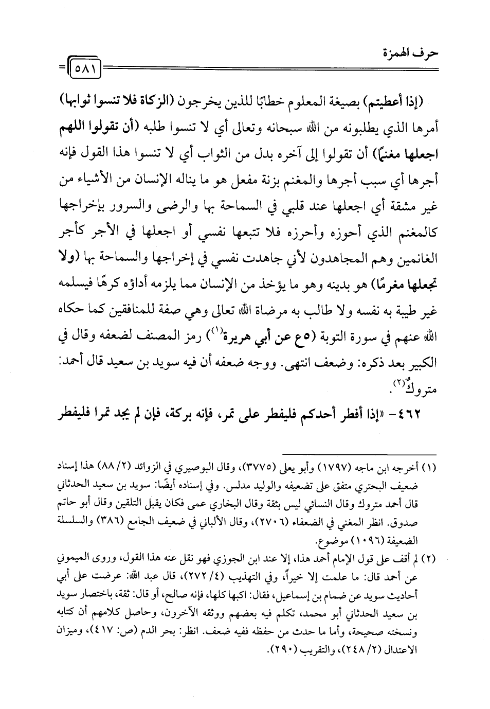 (إذا أعطيتم) بصيغة المعلوم خطابًا للذين يخرجون (الزكاة فلا تنسوا ثوابها) أمرها الذي يطلبونه من الله سبحانه وتعالى أي لا تنسوا طلبه (أن تقولوا اللهم اجعلها مغنمًا) أن تقولوا إلى آخره بدل من الثواب أي لا تنسوا هذا القول فإنه أجرها أي سبب أجرها والمغنم بزنة مفعل هو ما يناله الإنسان من الأشياء من غير مشقة أي اجعلها عند قلبي في السماحة بها والرضى والسرور بإخراجها كالمغنم الذي أحوزه وأحرزه فلا تتبعها نفسي أو اجعلها في الأجر كأجر الغانمين وهم المجاهدون لأني جاهدت نفسي في إخراجها والسماحة بها (ولا تجعلها مغرمًا) هو بدينه وهو ما يؤخذ من الإنسان مما يلزمه أداؤه كرهًا فيسلمه غير طيبة به نفسه ولا طالب به مرضاة الله تعالى وهي صفة للمنافقين كما حكاه الله عنهم في سورة التوبة (5 ع عن أبي هريرة (¬1)) رمز المصنف لضعفه وقال في الكبير بعد ذكره: وضعف انتهى. ووجه ضعفه أن فيه سويد بن سعيد قال أحمد. متروكٌ (¬2).