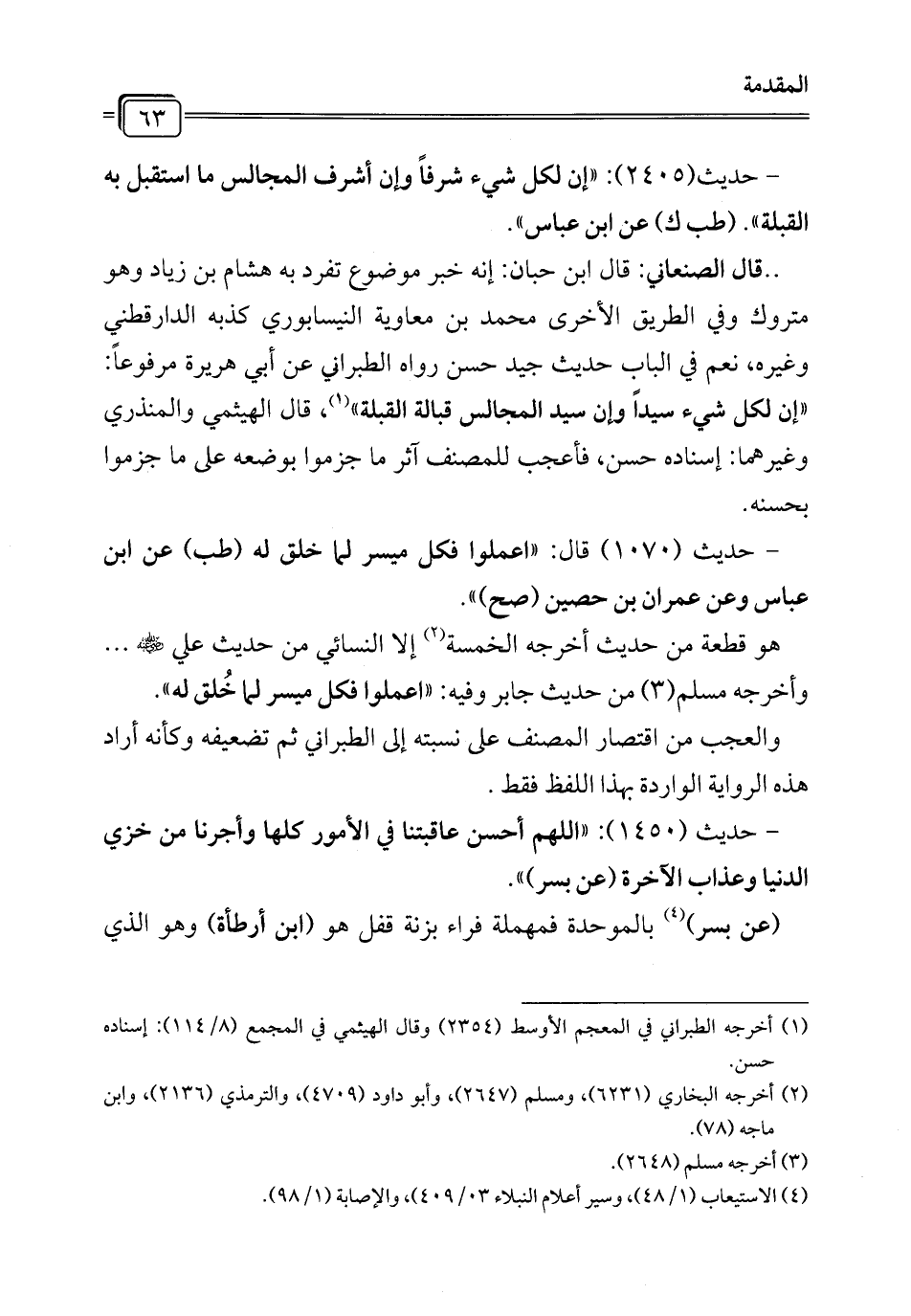 - حديث (2405): "إن لكل شيء شرفاً وإن أشرف المجالس ما استقبل به القبلة". (طب ك) عن ابن عباس".