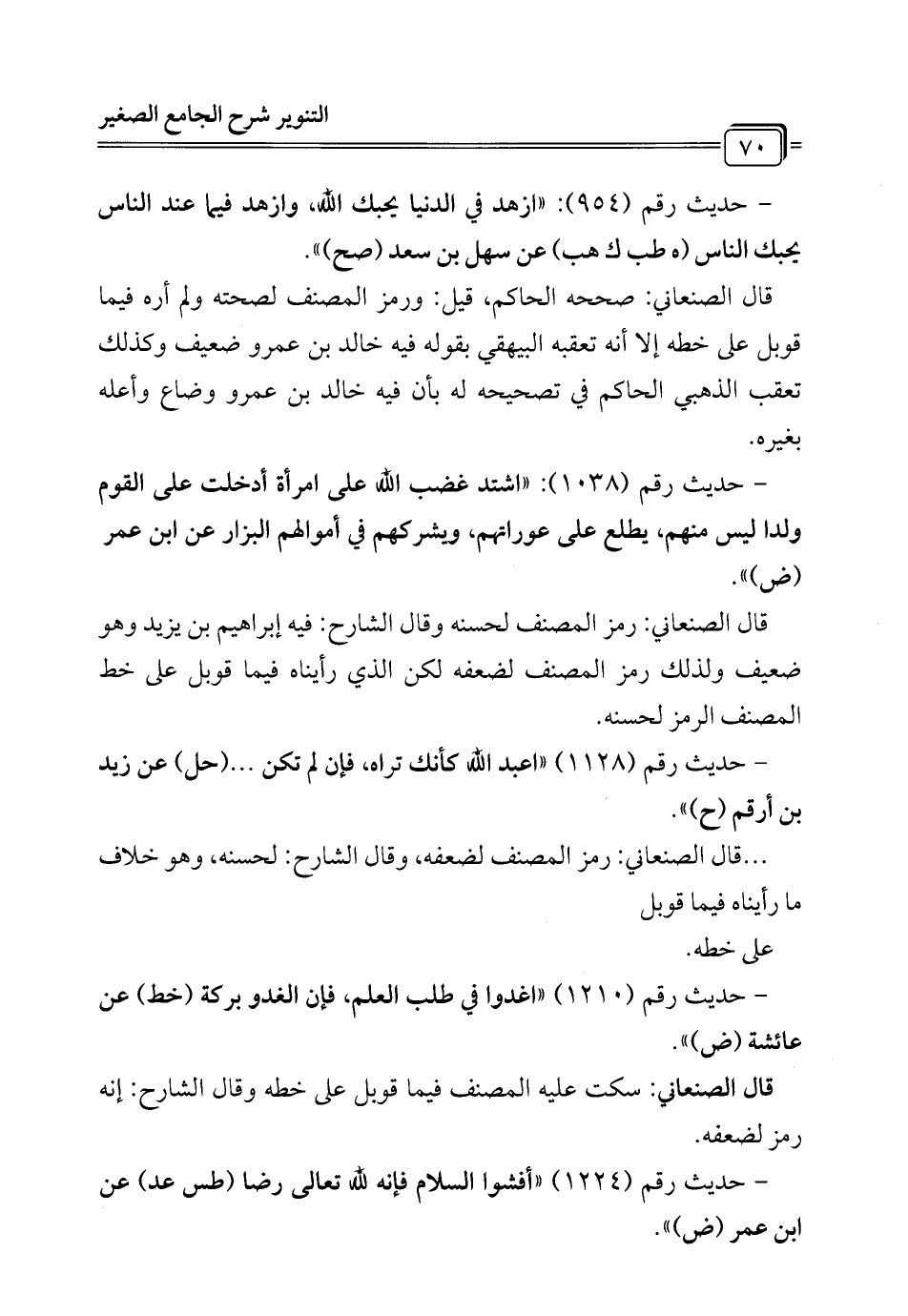 قال الصنعاني: رمز المصنف لحسنه وقال الشارح: فيه إبراهيم بن يزيد وهو ضعيف ولذلك رمز المصنف لضعفه لكن الذي رأيناه فيما قوبل على خط المصنف الرمز لحسنه.