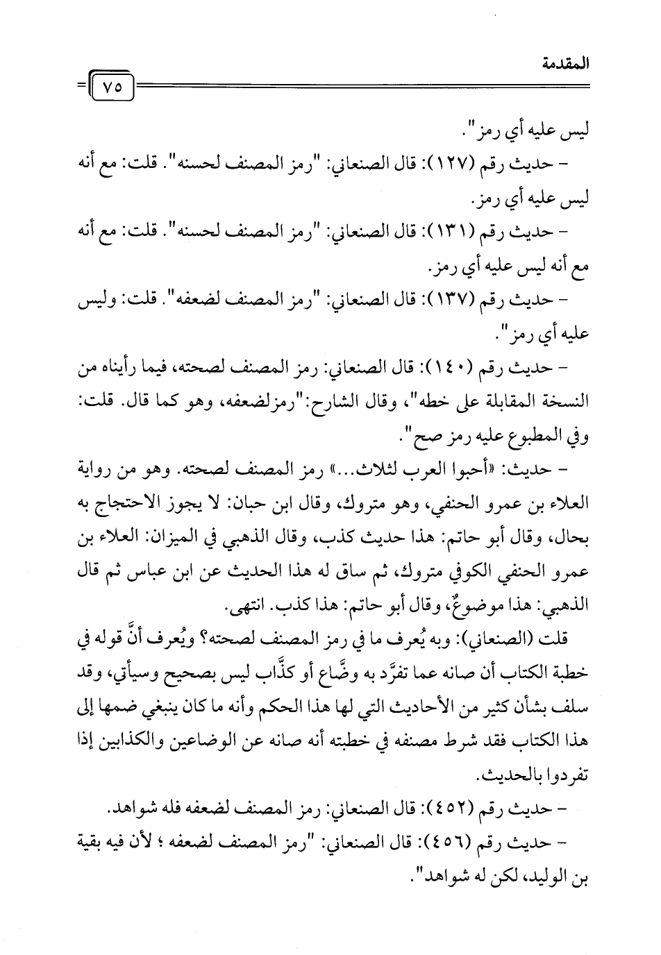 - حديث رقم (137): قال الصنعاني: "رمز المصنف لضعفه". قلت: وليس عليه أي رمز".