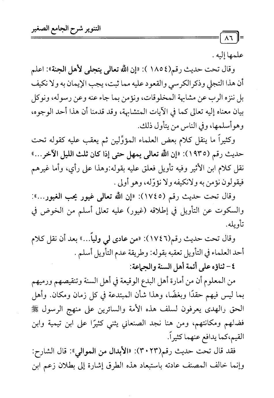 وقال تحت حديث رقم (1746): "من عادى لي ولياً ... " بعد أن نقل كلام أحد العلماء في التأويل تعقبه بقوله: وطريقة عدم التأويل أسلم.