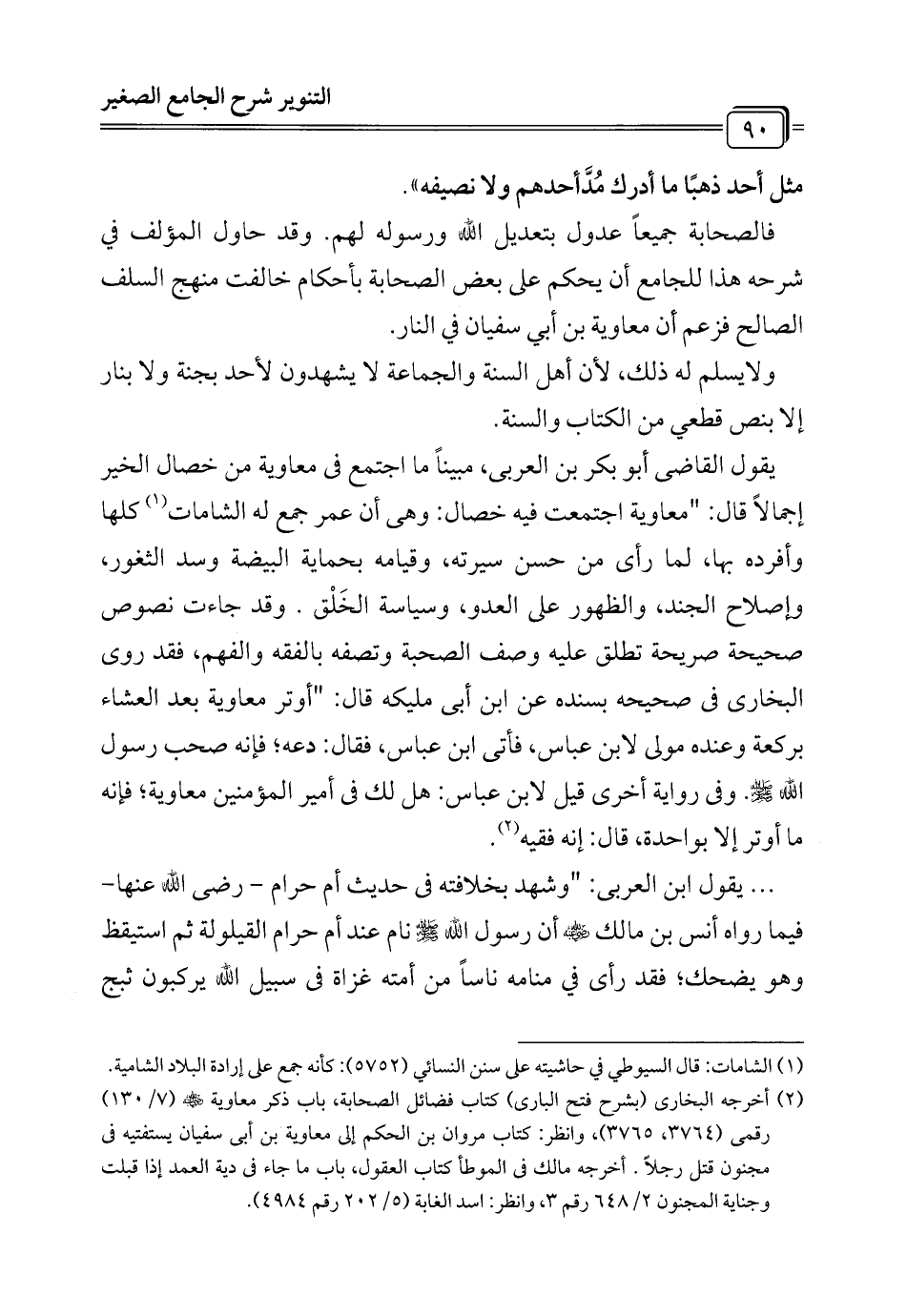 فالصحابة جميعاً عدول بتعديل الله ورسوله لهم. وقد حاول المؤلف في شرحه هذا للجامع أن يحكم على بعض الصحابة بأحكام خالفت منهج السلف الصالح فزعم أن معاوية بن أبي سفيان في النار.