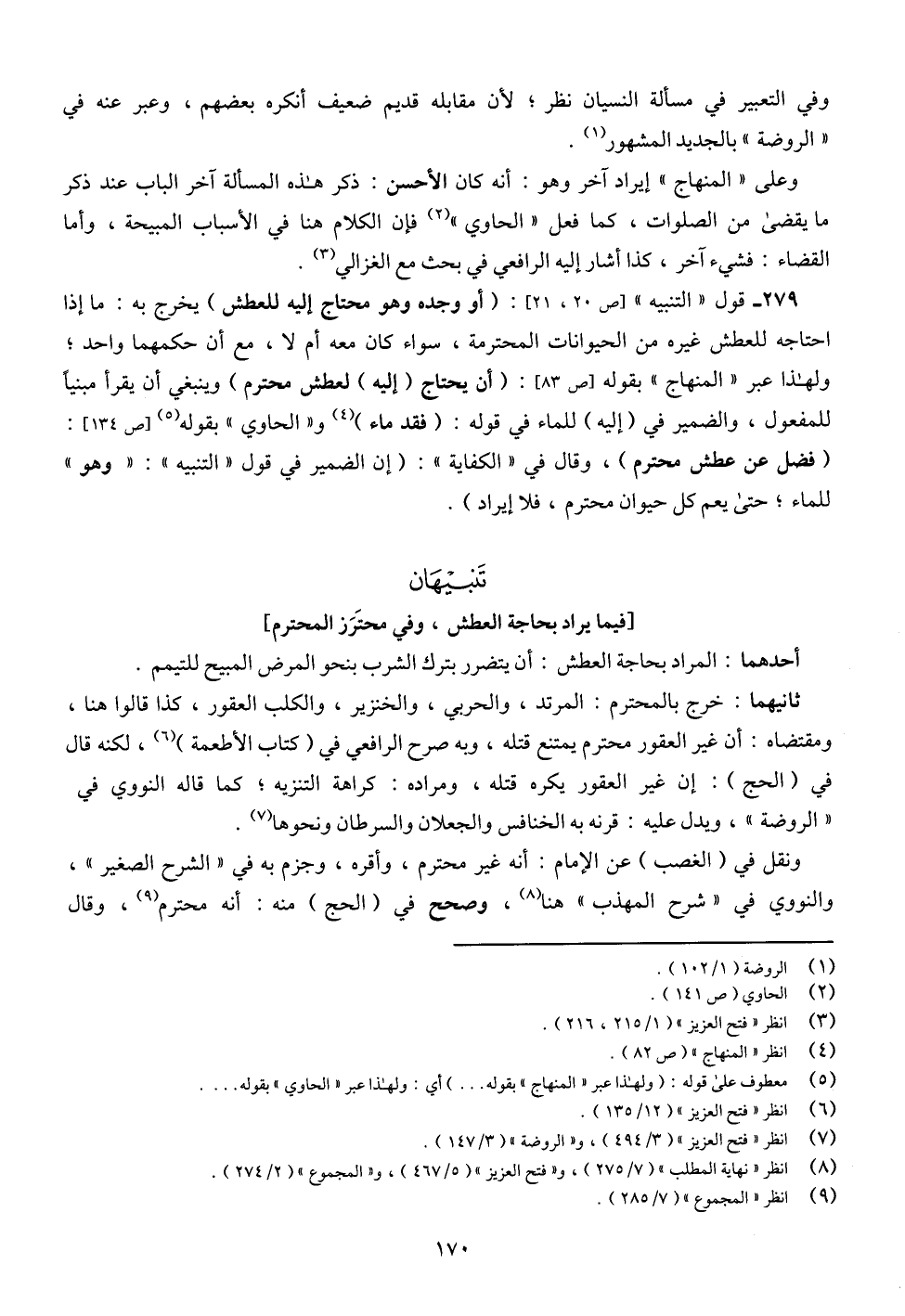 279 - قول "التنبيه" [ص 20، 21]: (أو وجده وهو محتاج إليه للعطش) يخرج به: ما إذا احتاجه للعطش غيره من الحيوانات المحترمة، سواء كان معه أم لا، مع أن حكمهما واحد؛ ولهذا عبر "المنهاج" بقوله [ص 83]: (أن يحتاج (إليه) لعطش محترم) وينبغي أن يقرأ مبنيًا للمفعول، والضمير في (إليه) للماء في قوله: (فقد ماء) (¬4) و "الحاوي" بقوله (¬5) [ص 134]: (فضل عن عطش محترم)، وقال في "الكفاية": (إن الضمير في قول "التنبيه": "وهو" للماء، حتى يعم كل حيوان محترم، فلا إيراد).