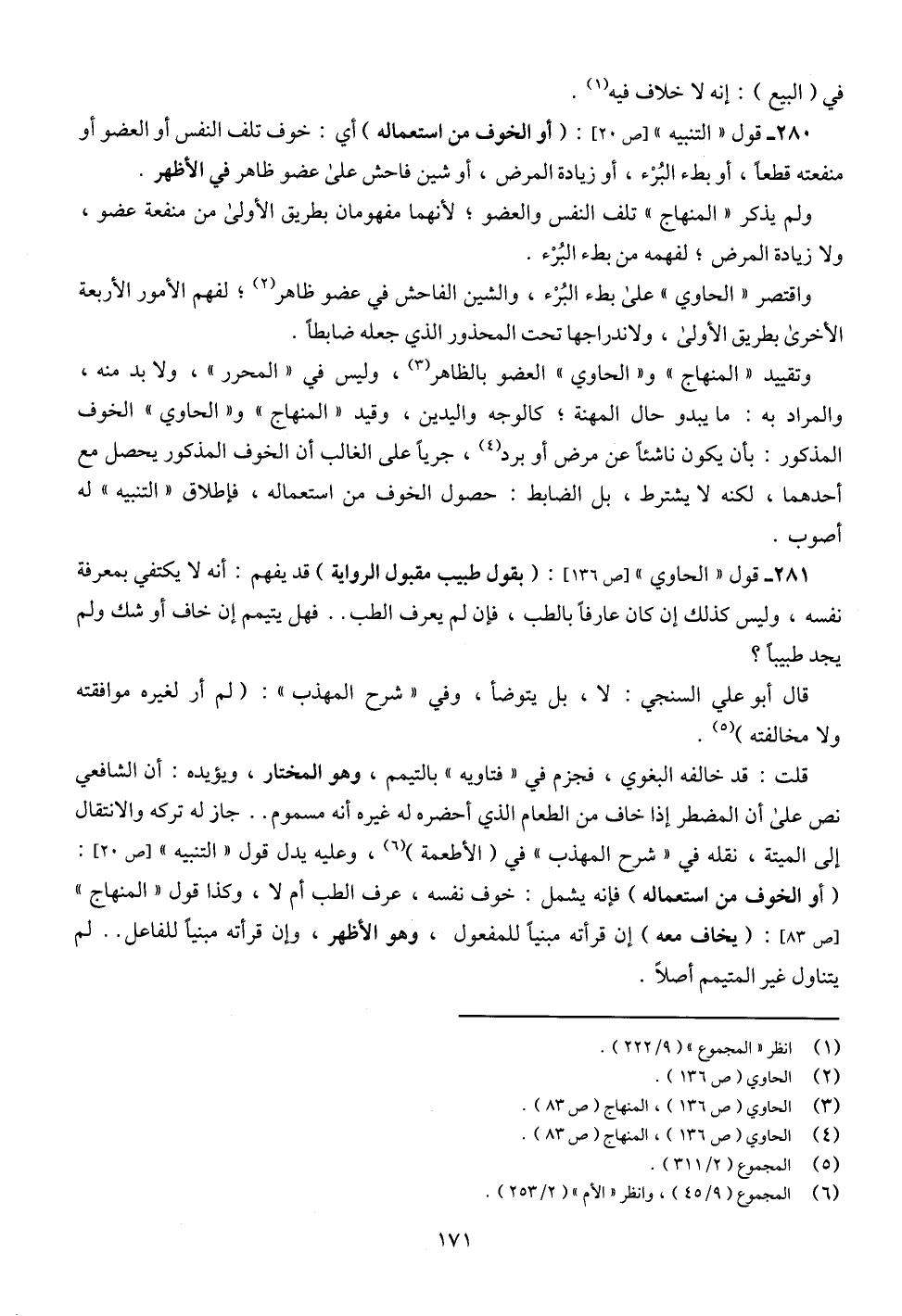 285 - قول "التنبيه" [ص 20]: (أو الخوف من استعماله) أي: خوف تلف النفس أو العضو أو منفعته قطعا، أو بطء البُرْء، أو زيادة المرض، أو شين فاحش على عضو ظاهر في الأظهر.